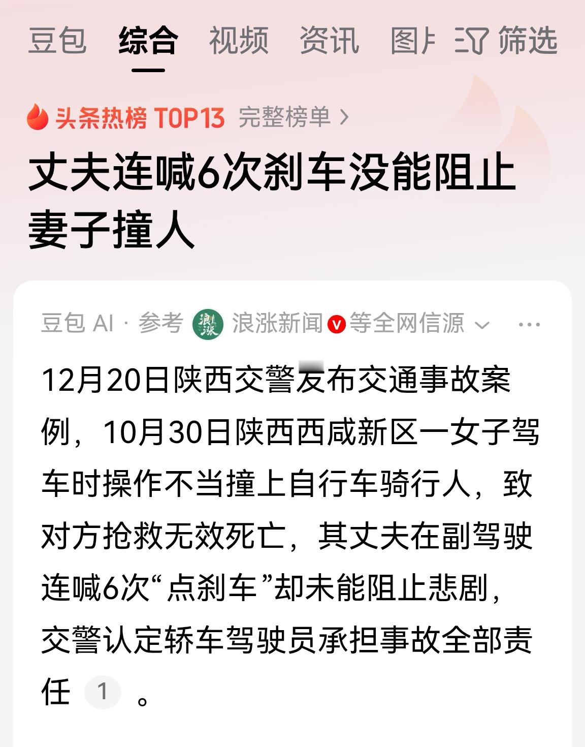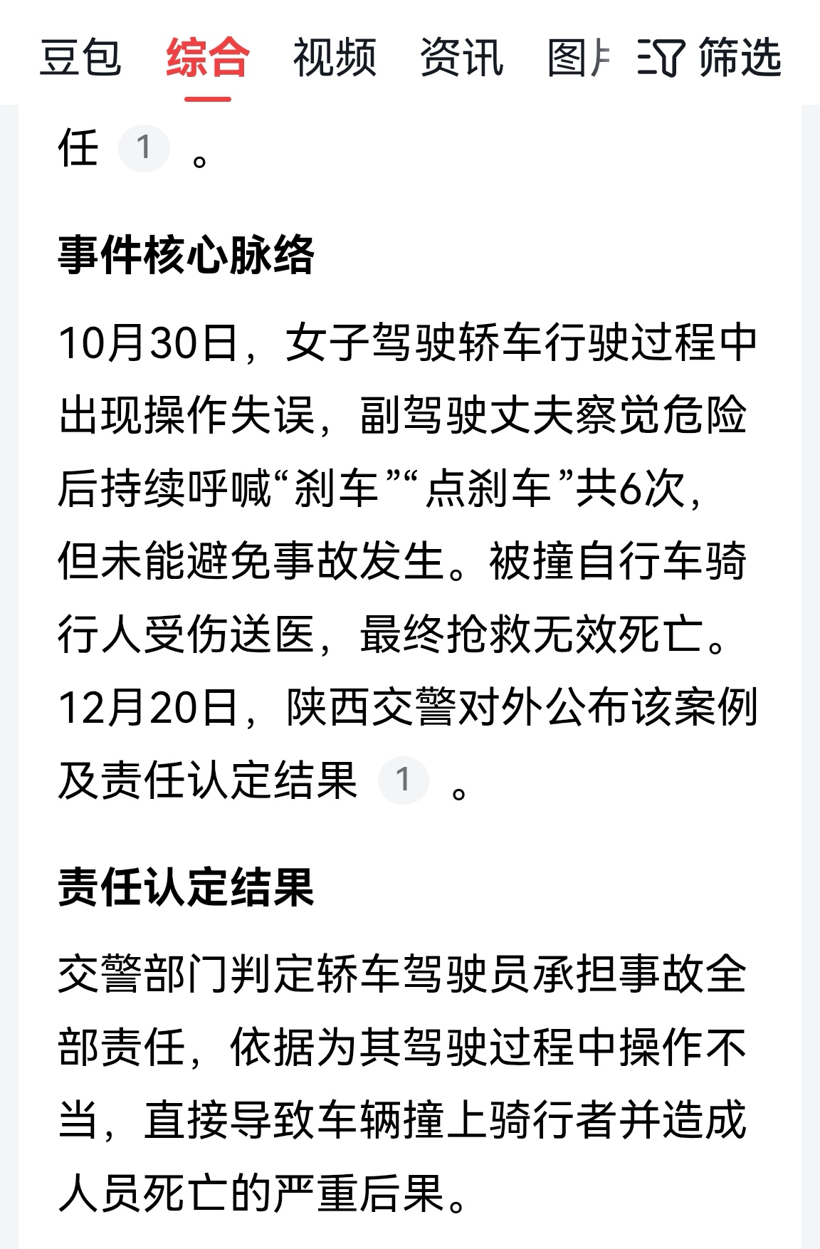 10月30日陕西西咸新区这场车祸,害得一条无辜生命没了!12月20日交警通报,女司机负事故全部责任。副驾位丈夫连吼6遍“点刹车”,眼睁睁看着妻子把油门踩到底,撞上骑车人!