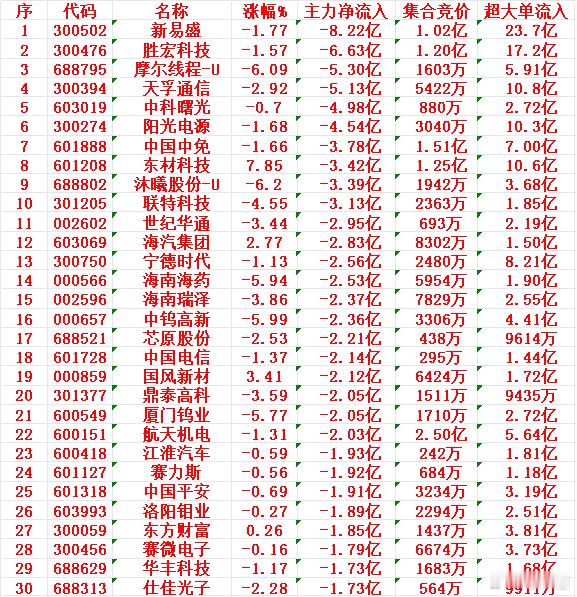 12月24日上午盘,主力趁低位,大幅买入的30名单中国卫星:涨幅 8.90%,净流入 8.07 亿元再升科技:涨幅 9.97%,净流入 7.72 亿元德明利:涨幅 8.08%,净流入 7.22 亿元香农芯创:涨幅 9.64%,净流入 5.68 亿元天际股份:涨幅 6.22%,净流入 5.45 亿元12月24日中午收盘,主力资金“大幅卖出”的30名单:新易盛:跌幅 1.77%,净流出 8.22 亿元胜宏科技:跌幅 1.57%,净流出 6.63 亿元摩尔线程-U:跌幅 6.09%,净流出 5.30 亿元天孚通信:跌幅 2.92%,净流出 5.13 亿元中科曙光:跌幅 0.70%,净流出 4.98 亿元