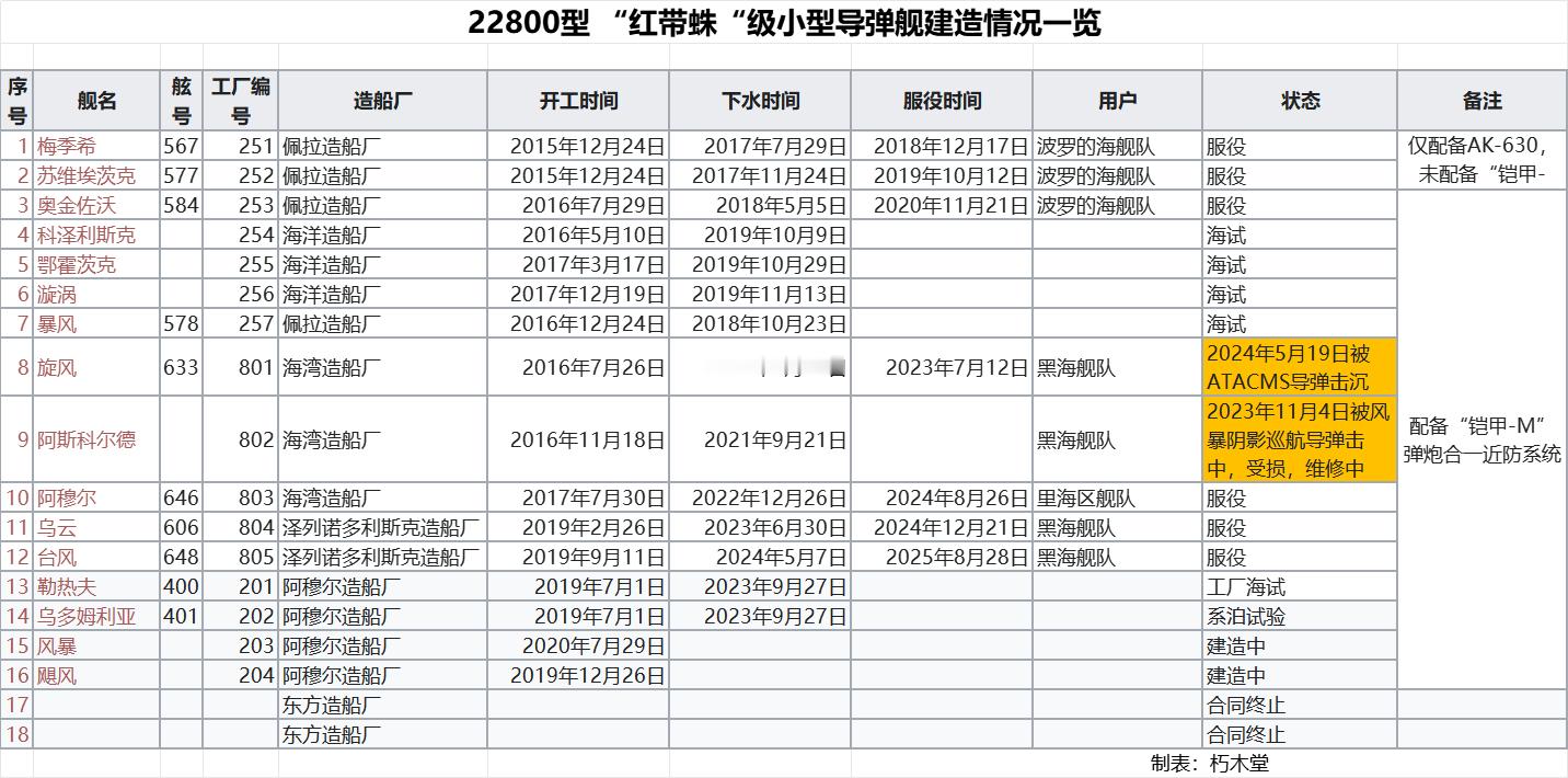 22800型小型导弹舰"勒热夫"号投入工厂海试2025年12月19日,俄罗斯《共青城城市周刊》(komcity)报道,2025年12月18日,阿穆尔造船厂股份公司建造的首艘22800型 “红带蛛“级小型导弹舰"勒热夫"号(工厂编号:№201)首次驶离符拉迪沃斯托克。该舰由阿穆尔造船厂股份公司(隶属于俄罗斯联合造船集团公司,位于阿穆尔河畔共青城)建造,于2024年10月被拖曳至阿穆尔厂位于符拉迪沃斯托克的交付基地,但直至现在才开始投入工厂海试。俄罗斯著名军事博客BMPD表示,"勒热夫"号是根据2018年8月22日俄罗斯国防部签署的一份合同建造的,该合同涉及为太平洋舰队建造六艘22800型小型导弹舰。其中四艘计划由阿穆尔造船厂股份公司(阿穆尔河畔共青城)建造,原定于2026年前交付;另外两艘则由东方造船厂股份公司(符拉迪沃斯托克)承建,原定于2023年前交付。然而,2020年,东方造船厂的两艘建造合同被取消。太平洋舰队首批两艘22800型小型导弹舰"勒热夫"号和"乌多姆利亚"号(工厂编号:№201和202)于2019年7月1日在阿穆尔造船厂正式开工,并于2023年9月27日下水。2024年10月,"勒热夫"号小型导弹舰从阿穆尔河畔共青城被拖曳至阿穆尔造船厂在符拉迪沃斯托克的交付基地,现在那里开始了测试。第三艘"乌苏里斯克"号(后更名为"飓风"号,工厂编号:№204)于2019年12月26日在阿穆尔造船厂铺设龙骨;第四艘舰"巴甫洛夫斯克"号(后更名为"风暴"号,工厂编号:№203)于2020年7月29日铺设龙骨。在2019年12月26日"乌苏里斯克"号小型导弹舰的正式开工仪式上,阿穆尔造船厂厂长弗拉基米尔·库拉科夫曾表示,阿穆尔厂计划比合同期限提早交付22800型小型导弹舰:最初计划在2026年交付全部四艘,但后来计划首批正式的两艘舰"勒热夫"号和"乌多姆利亚"号于2023年交付,另外两艘"乌苏里斯克"号和"帕夫洛夫斯克"号于2024年交付。事实上,正如预料的那样,阿穆尔造船厂的22800型小型导弹舰建造进度被大大延迟。至此,俄罗斯海军共有16艘22800型小型导弹舰分别在五家不同的企业建造。22800型 “红带蛛“级小型导弹舰由“金刚石”中央海洋设计局股份公司(圣彼得堡)设计,本应替代为俄罗斯海军建造的21631型(代号"暴徒-M")小型导弹舰。然而,由于22800型小型导弹舰配备了由高速M507D-1柴油机组成的主动力装置,而圣彼得堡"星"公司难以足量生产和交付这些发动机,导致22800项目变成了胡子工程,已经下水的船体多年来只能停在船厂码头边苦苦期盼发动机的到来。首批七艘22800型小型导弹舰自2015年起由佩拉造船厂股份公司(列宁格勒州)建造,该厂目前已向波罗的海舰队交付了前三艘:"梅季希"号(开工时名为"飓风",2018年更名,工厂编号:№251,2018年12月17日交付海军)、"苏维埃茨克"号(开工时名为"台风",工厂编号:№252,2019年10月12日交付)和"奥金佐沃"号(工厂编号:№253,开工时名为"阵风",2020年11月21日交付)。佩拉厂建造的第四艘小型导弹舰"暴风"号(工厂编号:№257)于2022年10月在波罗的海开始工厂海试,但至今尚未交付海军。由于主柴油机供应问题和资金问题而延迟,在佩拉造船厂进展缓慢、完工日期未知的三艘22800型舰是:"科泽利斯克"号(开工时名为"风暴",工厂编号:№254)、"鄂霍茨克"号(工厂编号:№255)和"漩涡"号(工厂编号:№256)。这些舰体的船体部分在费奥多西亚的"海洋"造船厂(克里米亚)建造,然后于2019年11月至2020年5月间通过内河航道拖曳至佩拉厂进行舾装。2016年8月,俄罗斯国防部还与泽廖诺多利斯克造船厂股份公司签署了为俄罗斯海军建造五艘22800型系列小型导弹舰的合同,合同交付期为2019-2021年。自2014年底以来,刻赤"海湾"造船厂一直处于泽廖诺多利斯克造船厂控制下,现在则通过Ak Bars造船集团股份公司的架构进行管理。根据这份合同订购的五艘小型导弹舰中,有三艘是在刻赤建造的。迄今为止,泽廖诺多利斯克造船厂订购的五艘22800型小型导弹舰中已有四艘交付使用:刻赤建造的"旋风"号(工厂编号:№801,2023年7月12日加入黑海舰队)和"阿穆尔"号(工厂编号:№803,2024年8月26日在里海服役);以及直接在泽廖诺多利斯克造船厂建造的"乌云"号(工厂编号:№804,2024年12月21日在里海服役)和"台风"号(工厂编号:№805,2025年8月28日在里海服役)。值得注意的是,"旋风"号小型导弹舰于2024年5月19日在塞瓦斯托波尔被乌克兰武装部队发射的ATACMS战术导弹击沉。第二艘在刻赤建造的"阿斯科尔德"号小型导弹舰(工厂编号:№802)于2022年10月开始工厂航行试验。然而,2023年11月4日,尚未服役的"阿斯科尔德"号在刻赤"海湾"造船厂的码头停靠时,被乌克兰武装部队发射的"风暴之影"空射巡航导弹严重损坏。该舰目前正在"海湾"造船厂进行维修,完工日期未知。值得一提的是,最初推测泽廖诺多利斯克造船厂订购的所有五艘22800型舰都是为太平洋舰队建造的。然而,根据时任俄罗斯海军总司令尼古拉·叶夫梅诺夫海军上将在2023年7月12日"旋风"号升旗仪式上的声明,所有这五艘舰都已转隶黑海舰队。