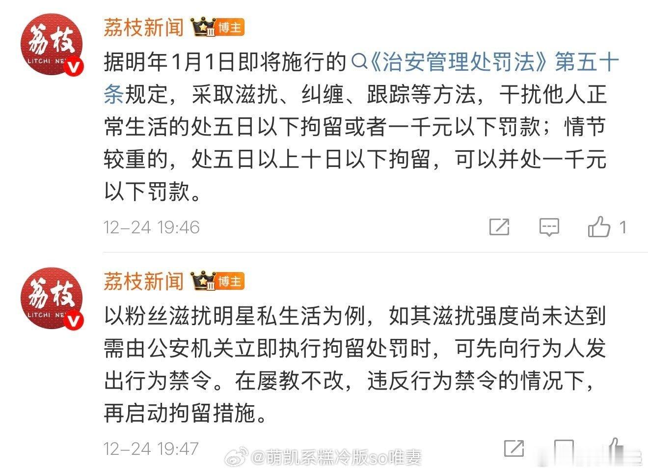 明年起私生粉滋扰纠缠明星明确违法 最近女演员朱锐自曝被跟踪六年的新闻,让“私生粉”问题再次引发热议。而从明年1月1日起,新修订的《治安管理处罚法》将正式施行,其中新增条款明确规定:采取滋扰、纠缠、跟踪等方法,干扰他人正常生活的,处拘留或罚款。同时,针对一些反复骚扰但情节尚不严重的行为,公安机关还可以先行发出“禁止接触令”,如果被禁者屡教不改再启动拘留,这样能更有效地预防和保护。这项法律为所有人都提供了更有力的保护。