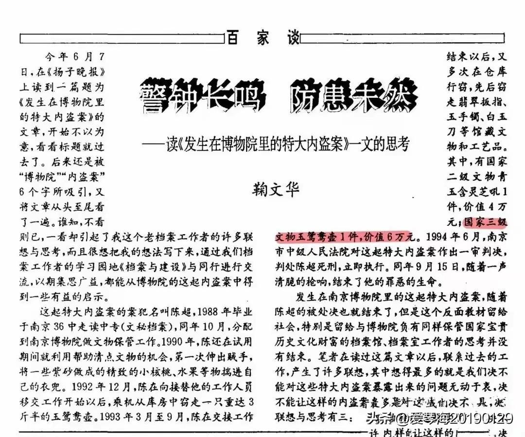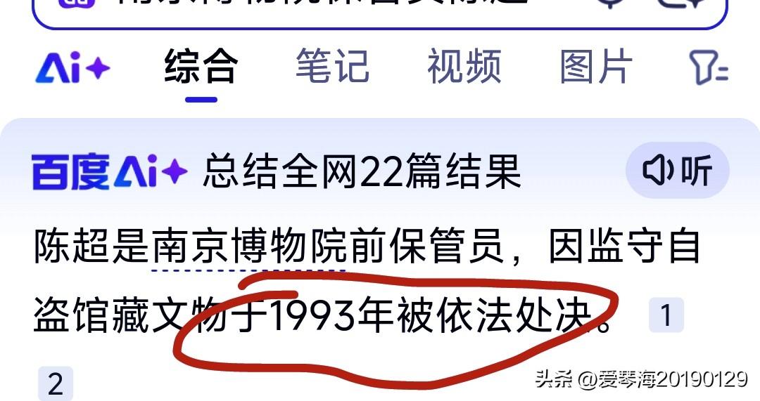 谁能想到“南博事件”竟然带火了一张旧报纸,只因为报纸中报道了一件事--《监守自盗的陈超被依法处决》,这个陈超就是南京博物院的一名保管员。报纸中说他利用南博保管员的身份监守自盗,共盗取南京博物院文物19件,总价值18万元,最后销赃得款3万元。 我看到的图片只是报纸的局部截图,内容也比较简单,但勾起了我的好奇心,于是搜索查看,AI说这个陈超是1993被枪毙的,还有的帖子说这案子是1994年判决的,众说纷纭、莫衷一是。后来终于找到一篇《警钟长鸣、防患未然》的文章,上面详细记载了这起发生在南京博物院的特大内盗案,上面明确记载案子是1994年判决的,执行时间是1994年9月15日。至此才算罢休,我喃喃自语: “AI给的答案也不要全信”。 写到最后,忽然觉得自己是不是有强迫症啊?你说大半夜的,不睡觉纠结这事干嘛呢? (图片来自网络)