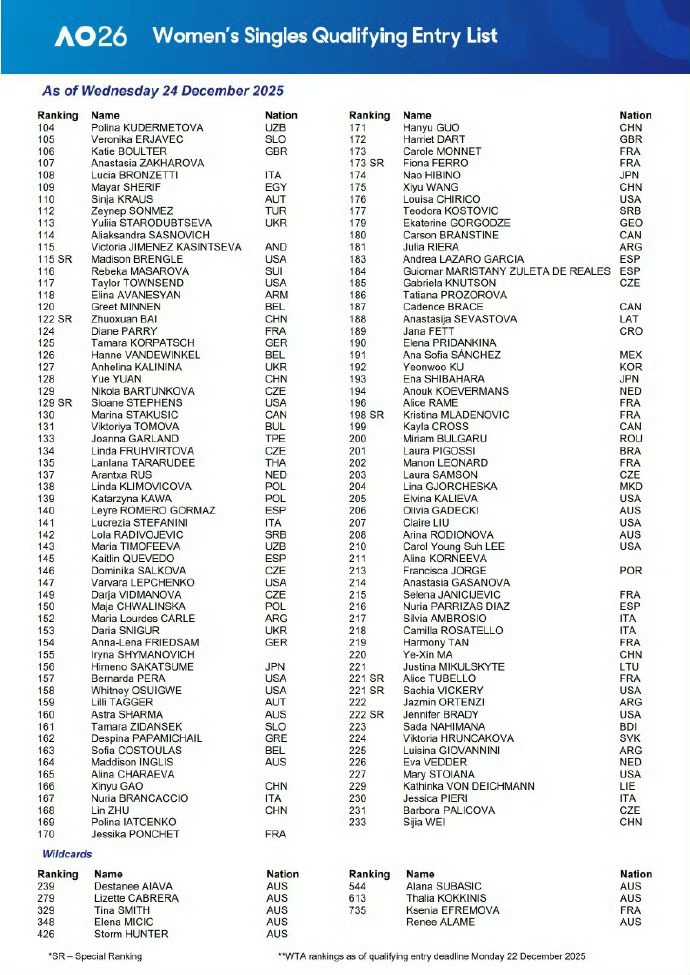 2026澳网资格赛名单公布 北京时间12月24日,2026澳大利亚网球公开赛单打资格赛名单公布,中国选手方面,白卓璇、袁悦、朱琳、高馨妤、郭涵煜、王曦雨、马烨欣、韦思佳入围女单资格赛。吴易昺将出战男单资格赛。中国香港选手黄泽林同样入围男单资格赛。10名中国球员入围澳网单打资格赛