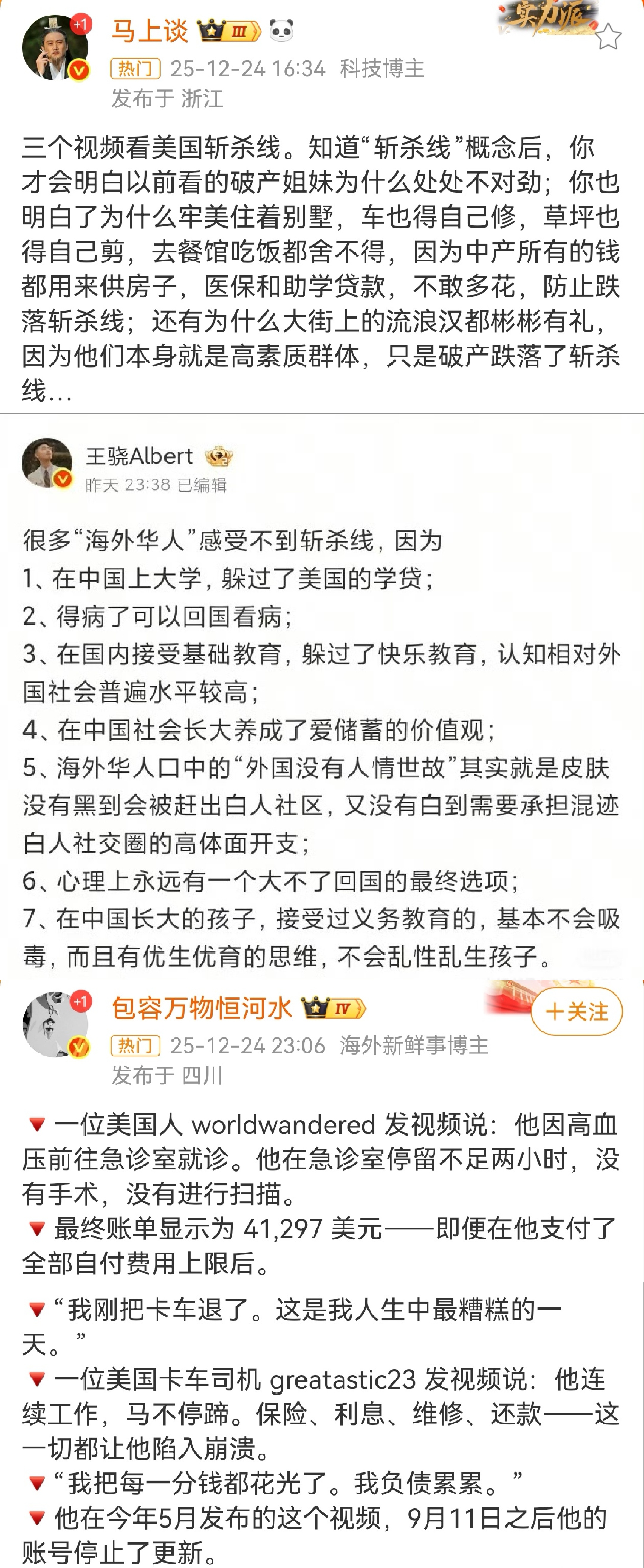近期,“美国斩杀线”游戏术语衍生成为网络热词,用来形容美国社会普遍存在的困局,一旦普通人遭遇重大变故,比如失业或重大疾病,如果没有家庭支持或足够储蓄,生活会迅速跌入谷底,个人只能街头流浪者。美国斩杀线时事满谈美国作为资本主义社会的“集大成者”,有光鲜亮丽的一面,更有着大量被忽视、被边缘化的人群,甚至有美国网红称他在旧金山快活不下去了。在全球最强经济体的美国,贫富差距下的两极分化,不仅长期存在,近年来更是愈演愈烈,那些贫穷的无家可归者,不是个人能力问题,反而是越努力越失败,这是一种现实的悲哀。“美国斩杀线”背后,是美国社会深层次的结构性矛盾,如贫富差距扩大、住房成本飙升、医疗保障薄弱、精神健康资源匮乏,以及系统性种族歧视等。再看中国,我们在享受40多年来改革开放的经济发展红利同时,也应该正视由此带来的贫富差距、阶层趋于固化问题,尤其是普通年轻群体上升渠道越来越窄的现状,这是经济快速发展下必然会有的“阵痛”,但中国终究是社会主义国家,讲究兜底式的“精准扶贫”。当然,会有人反驳,认为中国同样存在“斩杀线”。我想说,拿最基础的教育来说,新中国成立以来,持续降低社会文盲率,再穷不能穷教育,再看各地的希望小学,以及九年制义务教育、早餐工程,即便是被吐槽为应试教育的高考制度,依旧是普通人“向上走”且相对公平的通道。对比之下,美国教育的两极分化相当严重,反智言论在社会底层盛行,甚至有很多美国人相信“地平说”,认为地球是平的,特朗普再次当选美国总统,很大程度是靠着底层反智群体的选票,无家可归的他们,更容易被洗脑。特朗普屡屡发表有悖常识的言论,并非他傻,也并非维持“懂王”人设,实则是巩固个人“反智主义”的身份认同,巩固其在底层民众的基本盘,加之特朗普将“反智主义”者的声音,转化为政治精英脱离现实、无视民众诉求的“罪证”,更加强化自身对美国底层民众的影响。当前,美国式教育正加剧着社会的阶级固化。精英阶层知道教育的重要性,愿意在孩子的教育上花钱。没有得到足够教育资源的普通人,会因为基础教育的缺失,变得越来越反智,认为读书无用。美国斩杀线