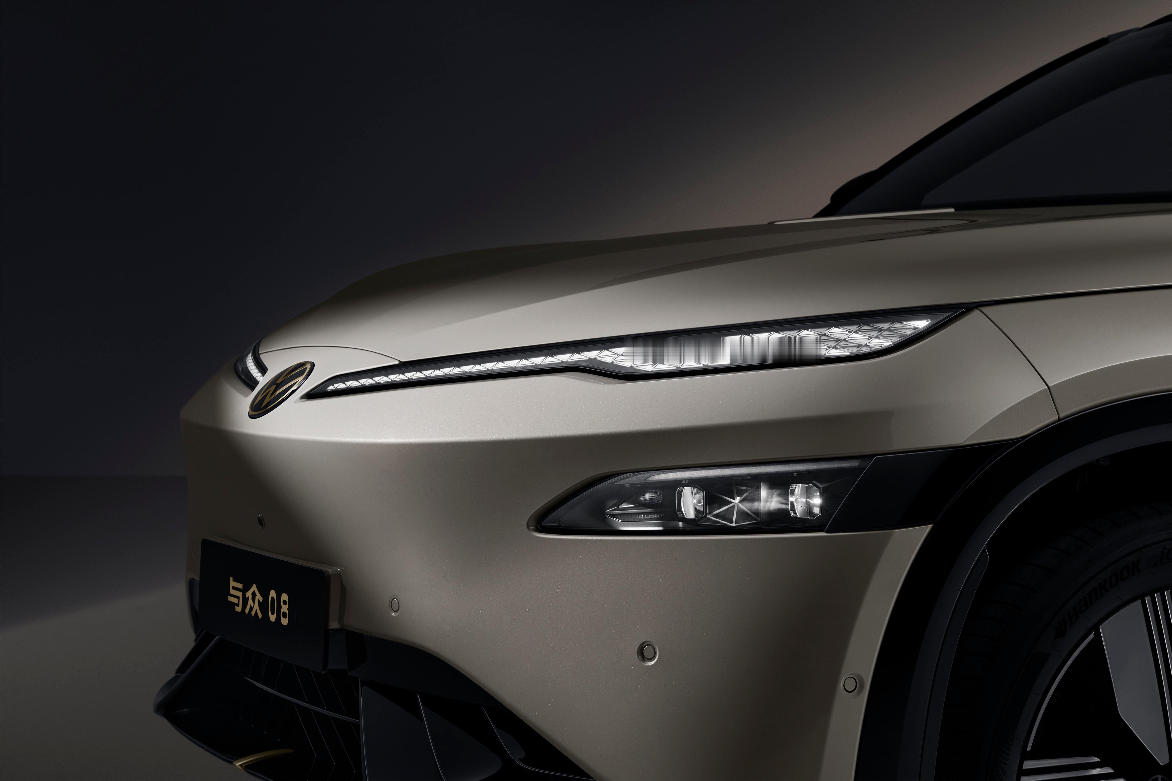 很想见见实车!金标大众  的设计团队在新车与众08 上更有趣和原创的分体式灯光结构:灯组上方辨识度极高的晶耀点阵大灯,如凝练的视线,定格整车先锋姿态。分体式结构下方采用隐藏式矩阵大灯设计,单侧灯近光区域能提供稳定超越1000lm亮度输出,可大面积均匀照亮前方路面;当矩阵大灯开启后,配合辅助远光功能,进一步提供超越2000lm总亮度输出。整灯两侧各包含16像素矩阵,可通过实时感知道路环境与对向交通状况,自动调节光型分布,精准避让前方车辆、对向车辆与行人,同时持续照亮必要区域,实现无需频繁切换远近光灯的自动防眩目功能。