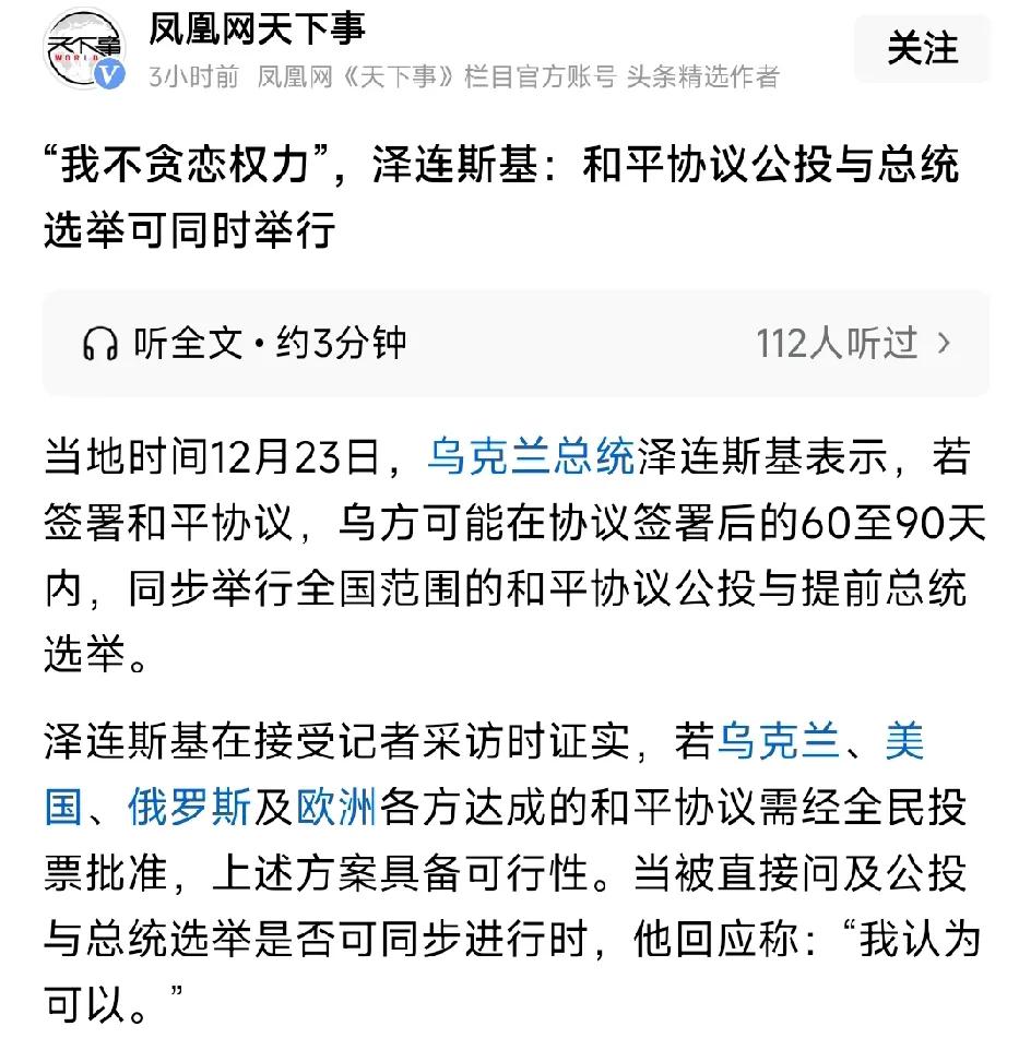 泽连斯基重申“无意贪恋权力”,并表明一旦条件允许,便会将职权交还选民。他强调提前举行总统选举是和平协议签署后的合理步骤,而非迫于政治压力的妥协。然而,这番话真能打消民众和国际社会的疑虑吗? 在政治的舞台上,权力的诱惑往往难以抗拒。泽连斯基的表态或许是为了安抚国内对其权力掌控的担忧,也可能是在国际舆论面前塑造一个“开明”的形象。但在乌克兰如今动荡的局势下,所谓的“条件允许”又该如何界定呢?是战争的完全结束,还是国内经济的恢复?这一切都充满了不确定性。 有政治分析家指出,政治人物的言辞往往需要结合实际行动来判断。泽连斯基是否能真正践行自己的承诺,还需时间来检验。毕竟,历史上不乏政治人物在局势变化后改变初衷的例子。 泽连斯基将公投与选举议题置于正在协商的一揽子战后文件框架下,这显示出他对乌克兰战后重建的系统性思考。这一框架包含了多边安全保障协议、双边安全框架以及经济复苏计划,共同构成了战后法律保障、安全防护与经济延续的支撑体系。 多边安全保障协议让乌克兰在国际社会中寻求更多的安全庇护,减少对单一国家的依赖。美乌双边安全框架则进一步巩固了与美国的关系,为乌克兰的安全增添了一份保障。而“乌克兰繁荣路线图”的经济复苏计划,无疑是乌克兰战后发展的关键。经济的复苏不仅能提高民众的生活水平,还能增强国家的综合实力。 然而,这些协议的协商和实施并非一帆风顺。在国际政治的博弈中,各方利益错综复杂。美国和欧洲在提供安全保障和经济援助时,必然会考虑自身的利益。乌克兰能否在这些协议中争取到最大的利益,将考验泽连斯基政府的外交智慧和谈判能力。今日分享随手拍照片 女人对你动了情,会怎样暗示你呢? 泽连斯基为什么要不停地向欧洲要钱 什么习惯会让人长寿