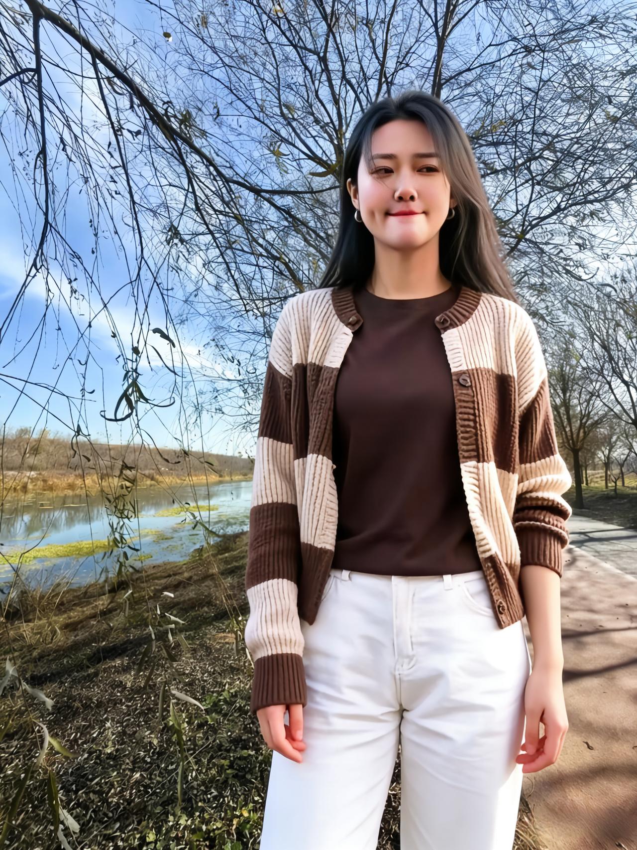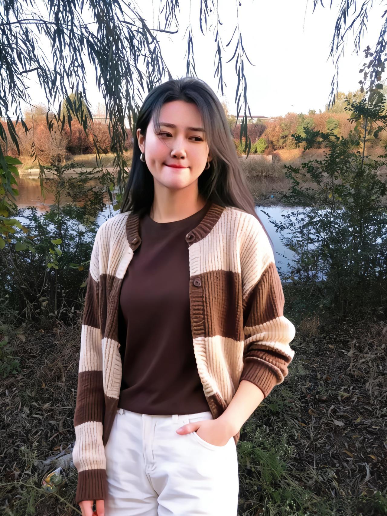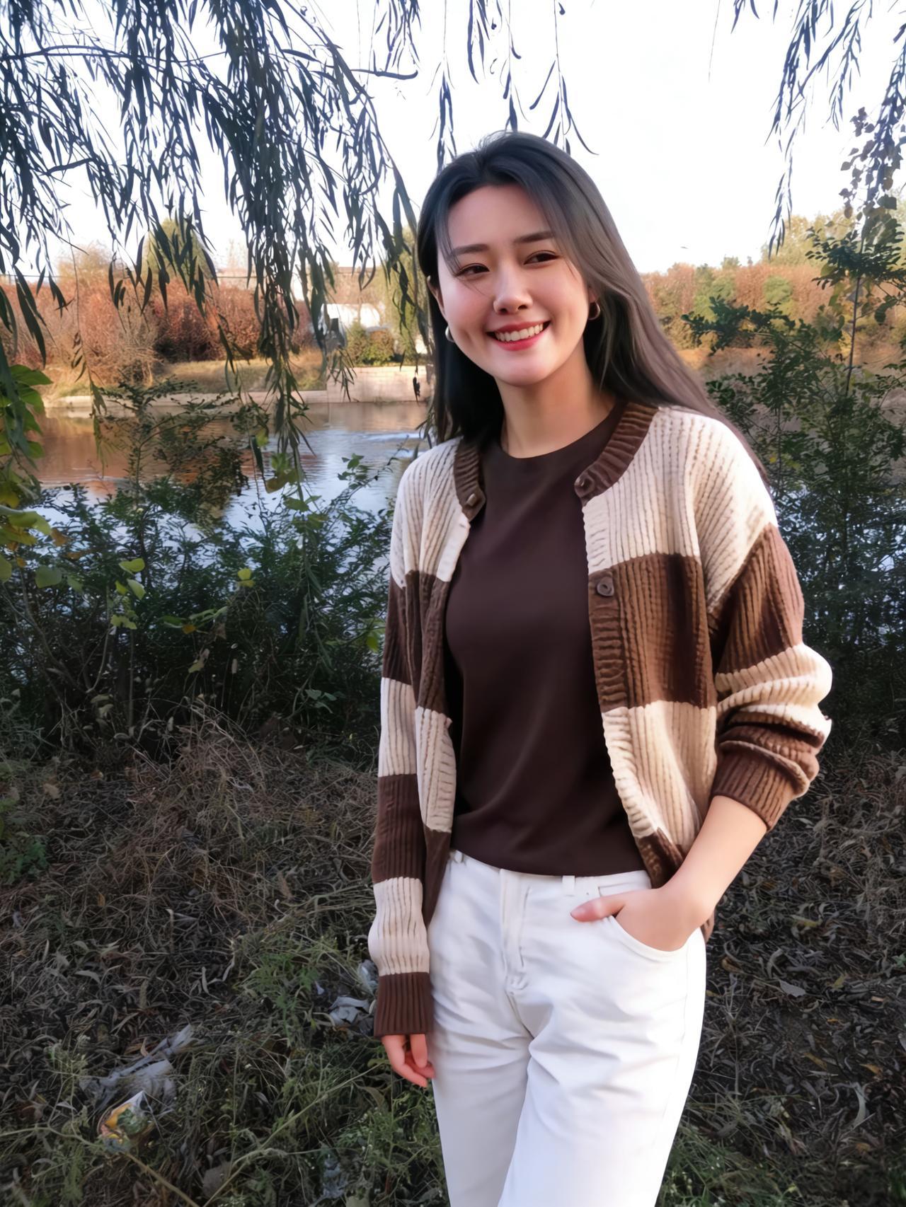 柳岸晴光映丽人,棕衫白裤衬清新。 开衫格纹凝秋韵,笑靥明霞染绛唇。 河水粼粼摇碎影,林风习习拂轻尘。 此间胜景谁能画,一帧温柔抵万金。