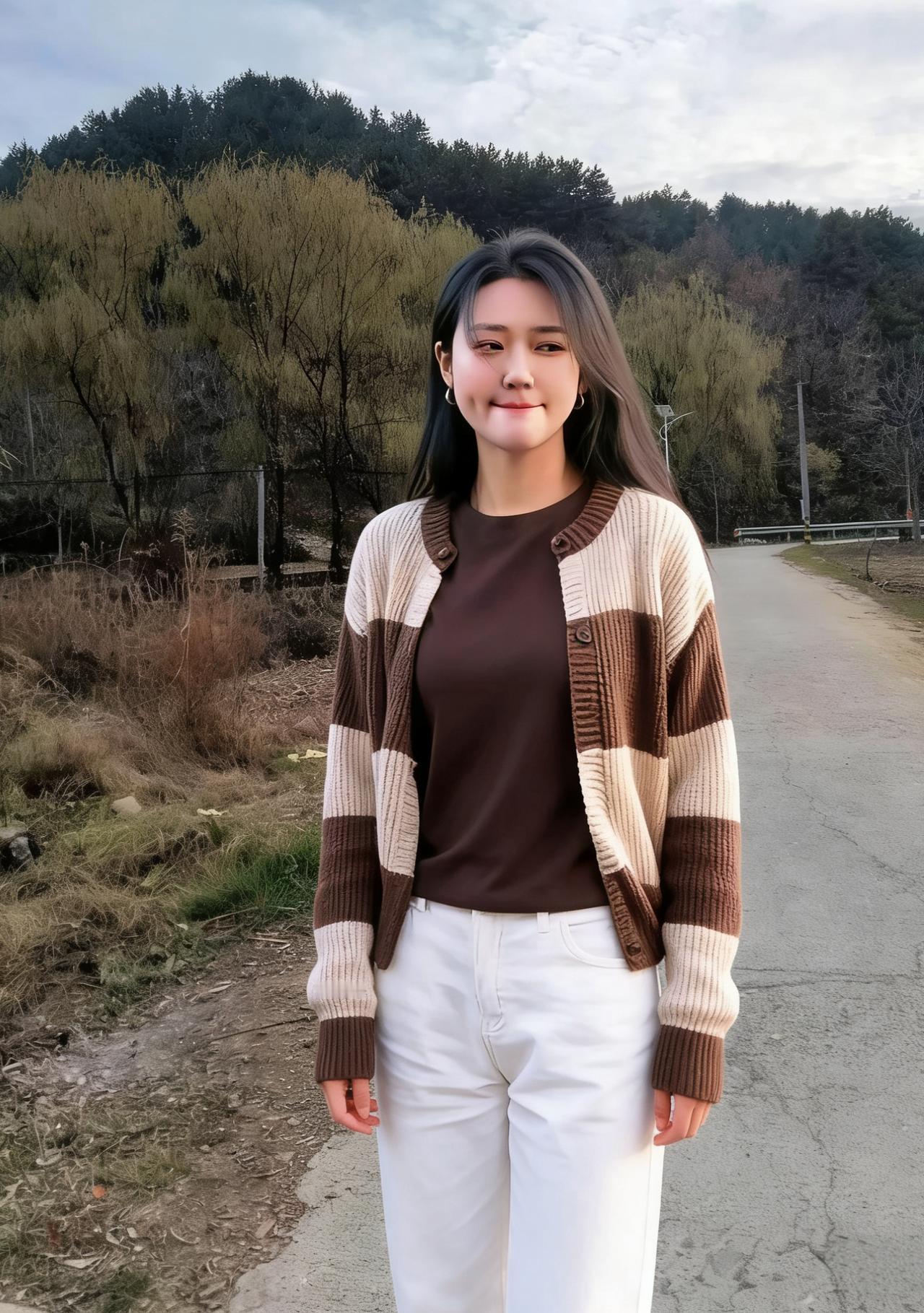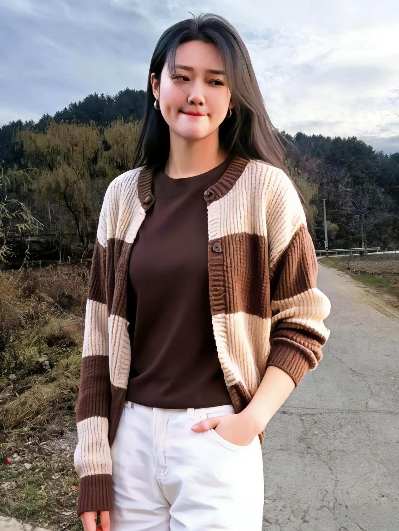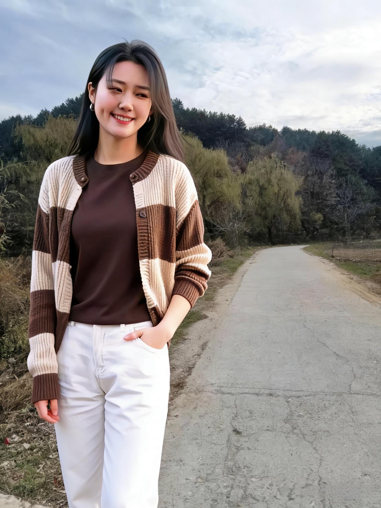 柳岸晴光映丽人,棕衫白裤衬清新。 开衫格纹凝秋韵,笑靥明霞染绛唇。 河水粼粼摇碎影,林风习习拂轻尘。 此间胜景谁能画,一帧温柔抵万金。