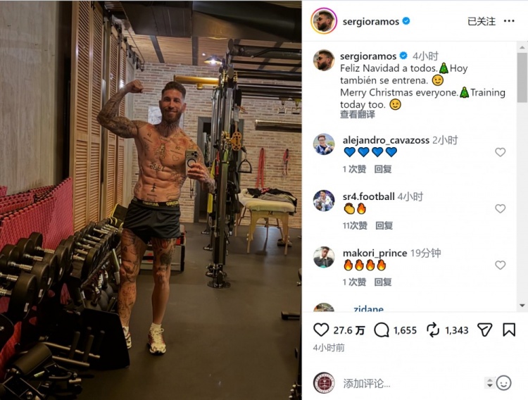 尚未确定下家!39岁拉莫斯社媒晒圣诞期间坚持训练照片