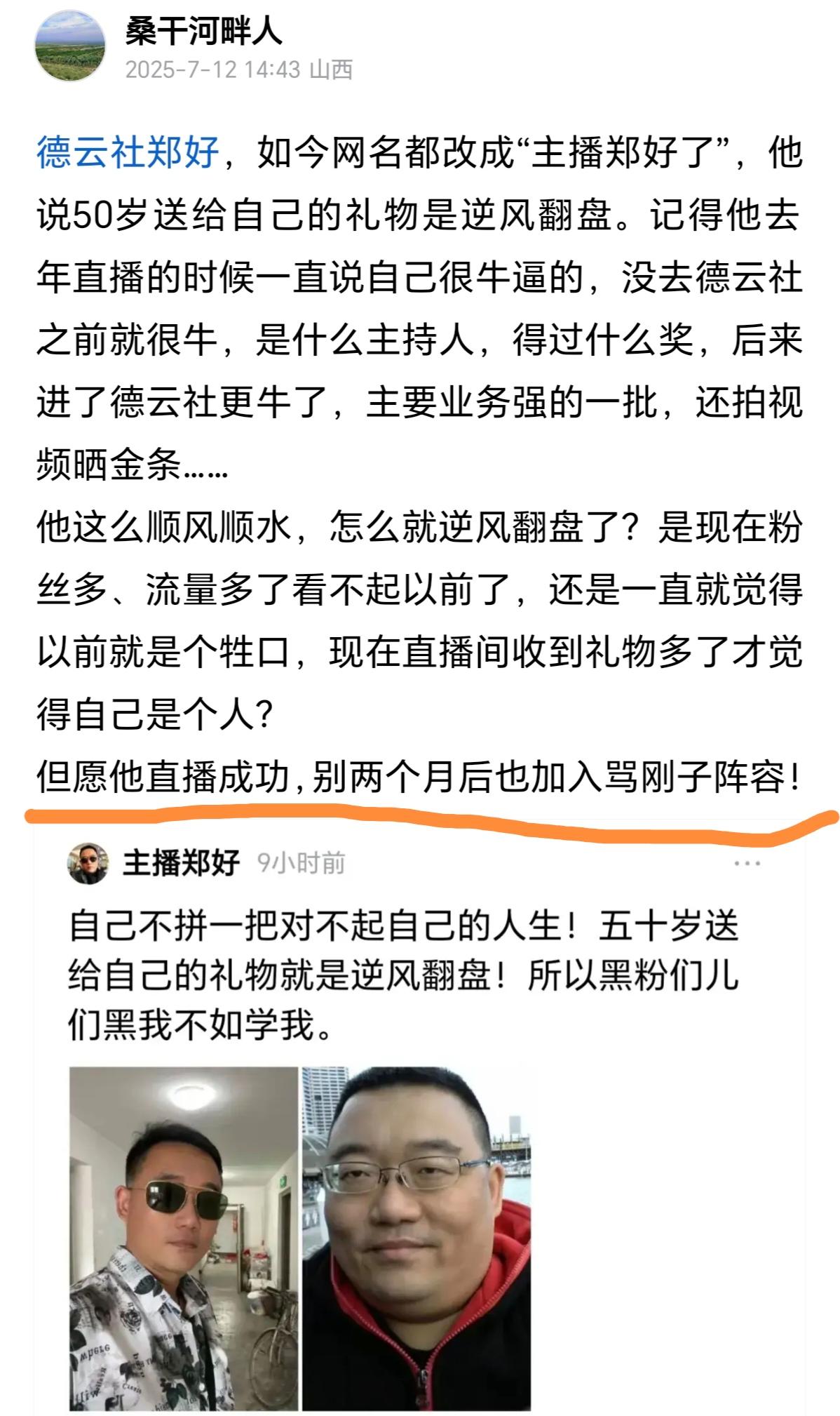 关于郑好,今年7月我发头条,说但愿郑好直播成功,别两个月后也加入骂刚子阵容。 现在是12月下旬,马上新年了,我推断完全不准确,这是五个月后了。可不论我推断准不准确,郑好现在肯定不舒服,他50岁送给自己最好的礼物——逆风翻盘,应该臭了,盘没翻了,风好像更大了,所以也不敢辞职…… 郑好其实改学二人转吧,他是东北人有这方面基因,直播看地人也多,我就挺喜欢二人转表演!