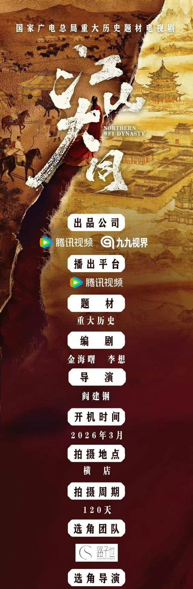 国家广电总局重大历史题材电视剧电视剧《江山大同》出品:腾讯视频 天璇工作室群导演:阎建钢(《赵氏孤儿案》)编剧:金海曙、李想领衔主演: 杨幂、刘学义特邀出演: 陈建斌题材:重大历史开机时间:2026年3月初拍摄周期:120天拍摄地:横店
