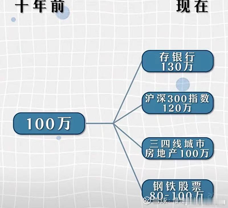 分镜1:十年前100万投资传统领域的现在价值,包括存银行130万、沪深300指数120万、三四线城市房地产100万、钢铁股票80万。分镜2:十年前100万投资成长型领域的现在价值,包括英伟达股票2.2亿、特斯拉2400万、苹果1100万、茅台股票900万、纳斯达克指数500万、黄金350万、一线房价200万、国债130万。