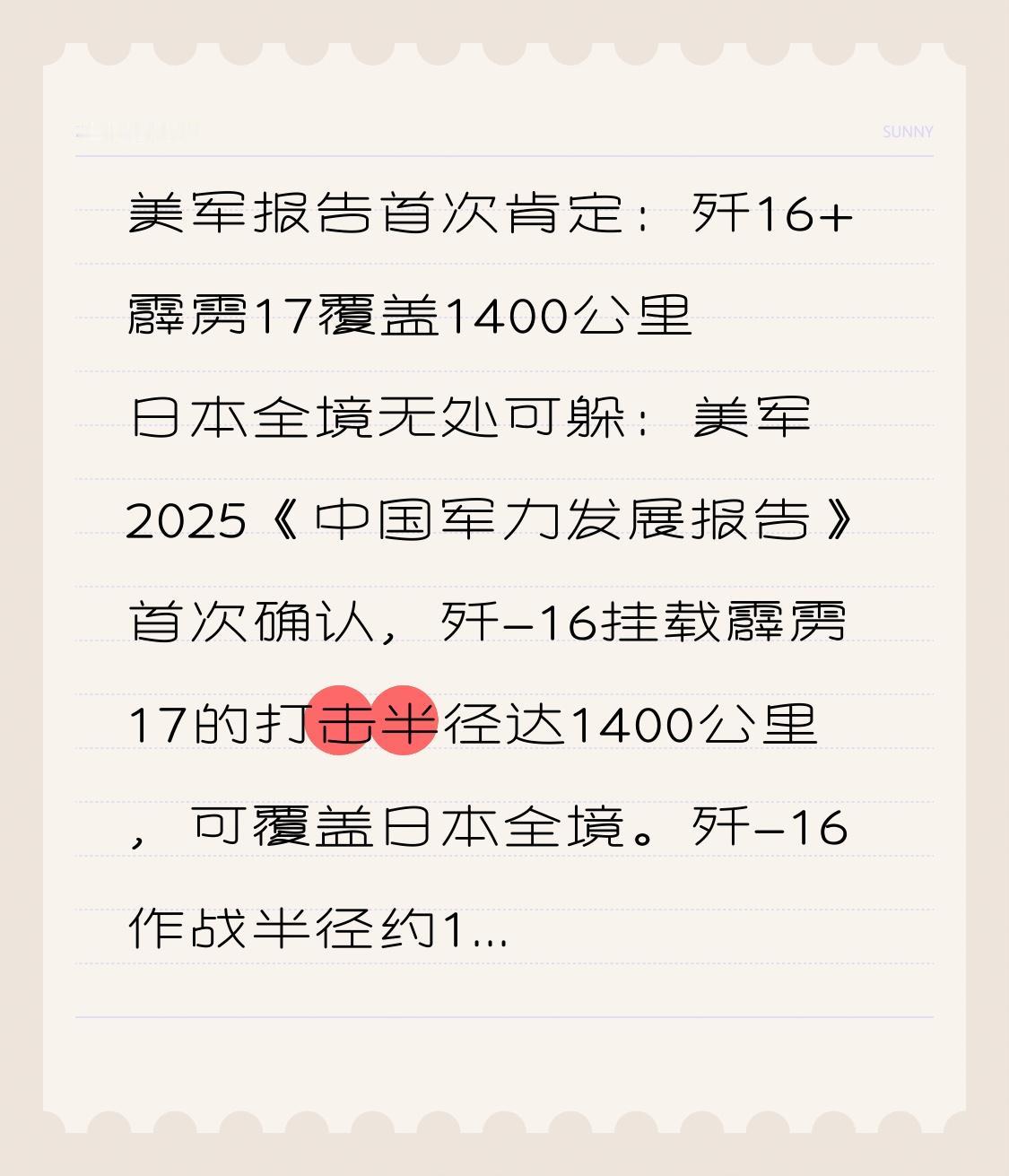 美军报告首次肯定:歼16+霹雳17覆盖1400公里 日本全境无处可躲:美军2025《中国军力发展报告》首次确认,歼-16挂载霹雳17的打击半径达1400公里,可覆盖日本全境。歼-16作战半径约1000公里,霹雳17射程400公里,针对空中关键节点,需体系引导,作战时与歼-20等配合应对日本F-35,其威慑力让美军重视。