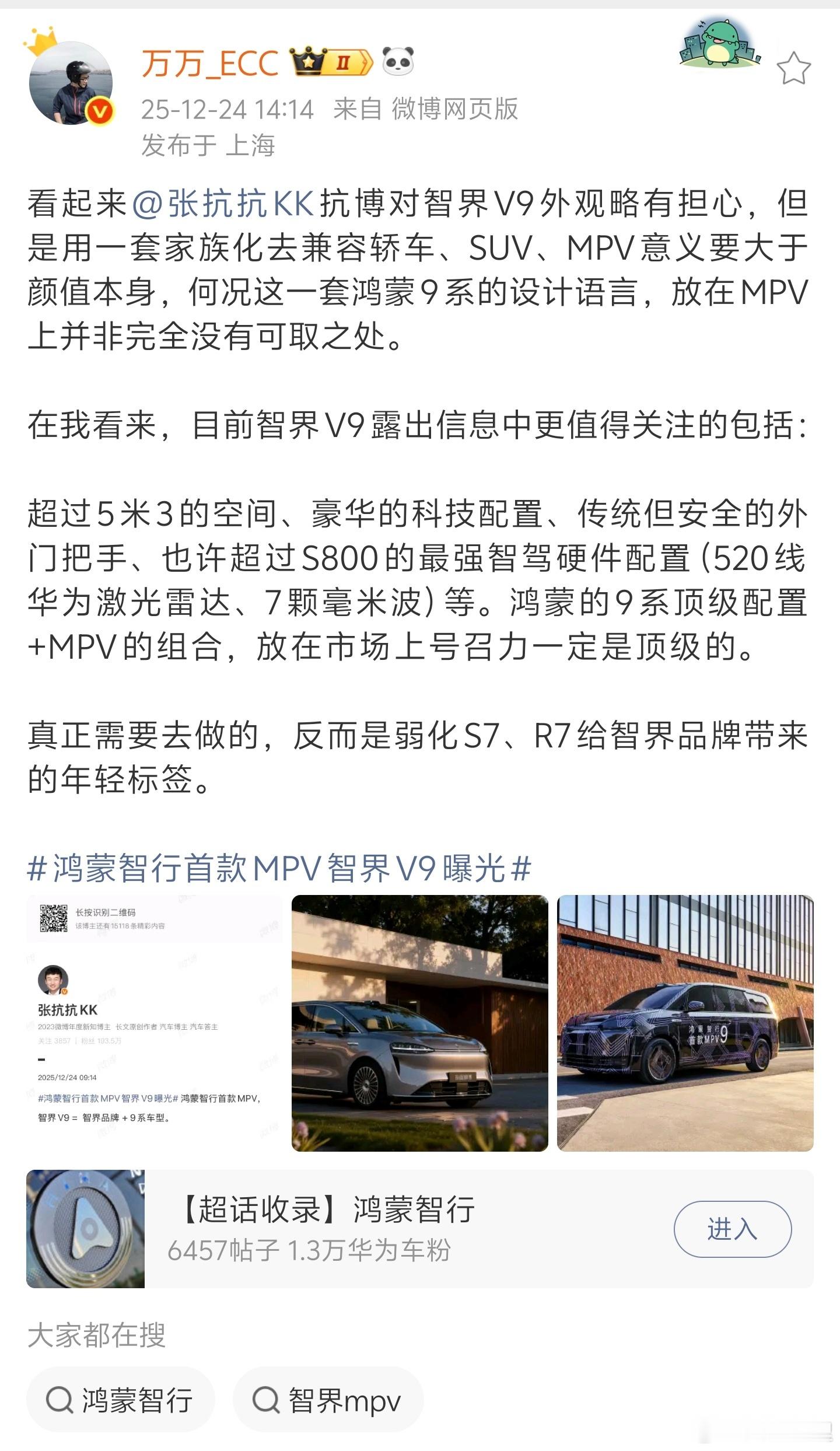 智界V9的设计会是挑战么?看到和两位老师在讨论智界V9的设计问题,觉得挺有感触的,其实我自己就经历了“设计无用论”到“设计很重要”这个变化。先说说我的理解,创新的设计毫无问题,问题在于如何定义和解读你的设计,找到喜欢你的这一批种子用户,我举个例子就会很明白:年轻读大学的时候,我觉得学校的姑娘大多数都很普通,好看的是极个别,但工作到现在,偶尔回到大学校园,我觉得学校的姑娘们大多都挺好看的,不好看的是极个别(当然,还是媳妇最好看)。这里的原因是什么,因为我的判断标准发生了变化,对美的接受能力发生了改变。汽车同样也是这样,作为创新设计的车型,需要找到适合它的用户成为种子选手。那么作为MPV来说,它的客群是什么样的呢?是类似R7和S7那样的年轻潮美用户么?我觉得可能有一部分,但更多的可能是年纪更大一些的家庭和商务叠加用户。在原来这样的客群里,可能更多会牺牲家庭来满足商务的需求,选择类似于埃尔法这样的前脸造型。但现在鸿蒙智行给了更多的选择,就是让商务和家用得以共存,让衣服的正反两面都能够妥帖和恰好。对于智界来说,这也是一个非常好的机遇,将自己的客群范围进一步拉大,从潮美年轻用户走向中坚群体,众所周知,鸿蒙智行在高端市场拥有超强的影响力。所以,我是赞同智界采用创新的设计,而且这个设计也非常重要,并不亚于各种配置的魅力,毕竟:再有趣的灵魂,也需要一副好看的皮囊。智界V9