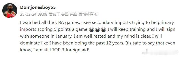 自认CBA排名前三的外援又开始喊话了,让CBA球队在明年一月份把自己签了。已经不记得这是多米尼克-琼斯第几次公开求职了。这次他还不点名嘲弄了一位单场只得到5分的外援。琼斯在微博上写道:“我看了所有的CBA比赛。那些试图扮演核心外援的低水平外援单场只得5分,我会保持训练,一月份就会和某支球队签约。我现在身心状态俱佳,头脑清晰,我会像过去12年那样继续统治比赛。即便是在当前,我依旧是CBA前三的外援!”他说的这个单场才得五分的核心外援是谁?