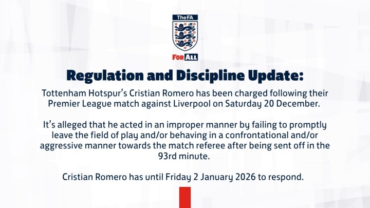 英超第17轮热刺vs利物浦补时阶段,罗梅罗因被犯规后的报复动作被出示第二张黄牌,被罚下场。英足总发布公告,称罗梅罗在红牌后存在不当行为。
