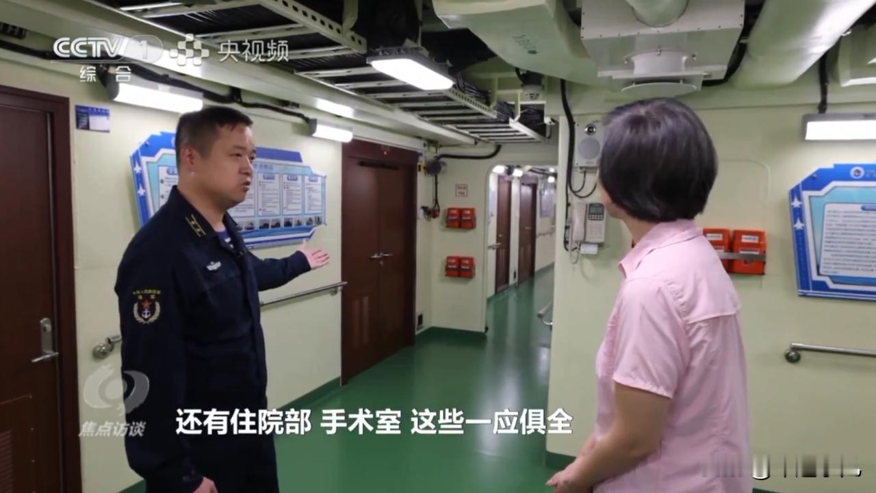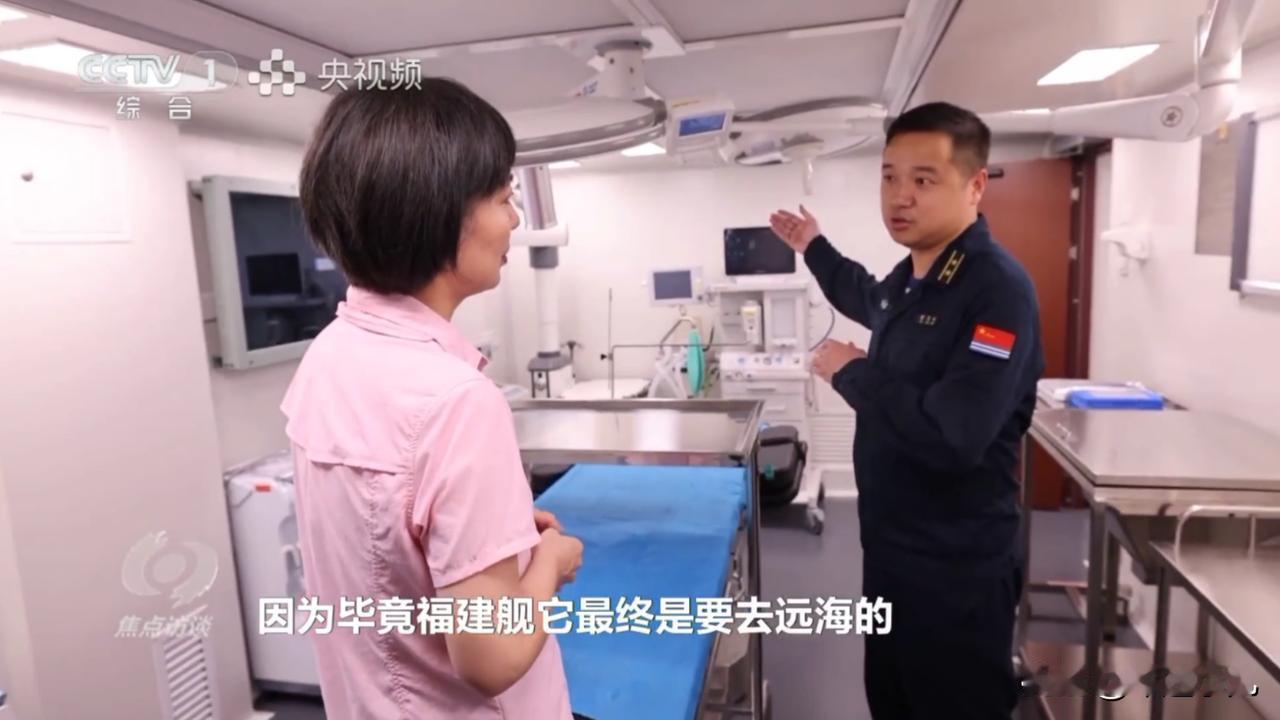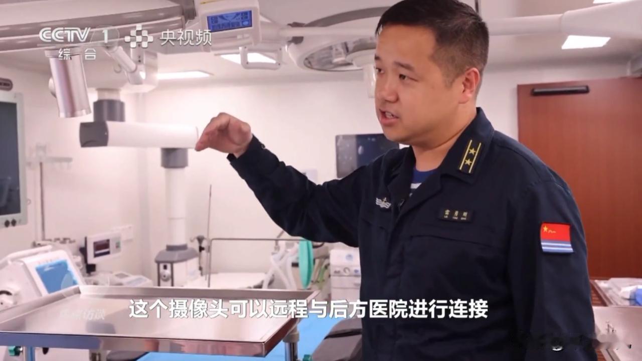 福建舰“医院”手术室首次公开,无影灯下暗藏关键设备,有大用处…… 这绝对是第一次公开,福建舰的舰上医务中心,而且还说了,这是目前人民海军作战舰艇中最大的医务中心,没有之一! 手术室和住院部一应俱全,各类检查医疗设备和手术设备也是非常齐全先进的,在介绍手术室的时候,还特意说了,手术室无影灯下方还有一个特殊的摄像头! 通过画面可以看到,手指着的突出来的专用摄像头,这个摄像头可以连接后方的医院,医疗专家可以远程进行指导会诊,这应该是就是之前一直说的5G技术的医疗应用场景,通过远程视频,查看病情以及病灶相关情况,给出指导医疗方案! 因为,福建舰,注定是要远航的,远海大洋,无论是人员作战损伤还是日常突发疾病,舰上的医务人员,可能对有些疾病和手术方案,不是那么了解,这时候,这个摄像头的作用就体现出来了! 另外,画面中,还可以看到福建舰的住院部病房内部,整体非常整洁干净,虽然,看起来空间上有些局促,但是,这已经很大了,毕竟,舰上空间很珍贵,能同时容纳10张病床的房间,已经是非常的大了! 这还是头一次,在焦点访谈节目中看到福建舰,之前,辽宁舰和山东舰,也登上过焦点访谈吗? 大家觉得怎么样?评论区说说你的看法!福建舰