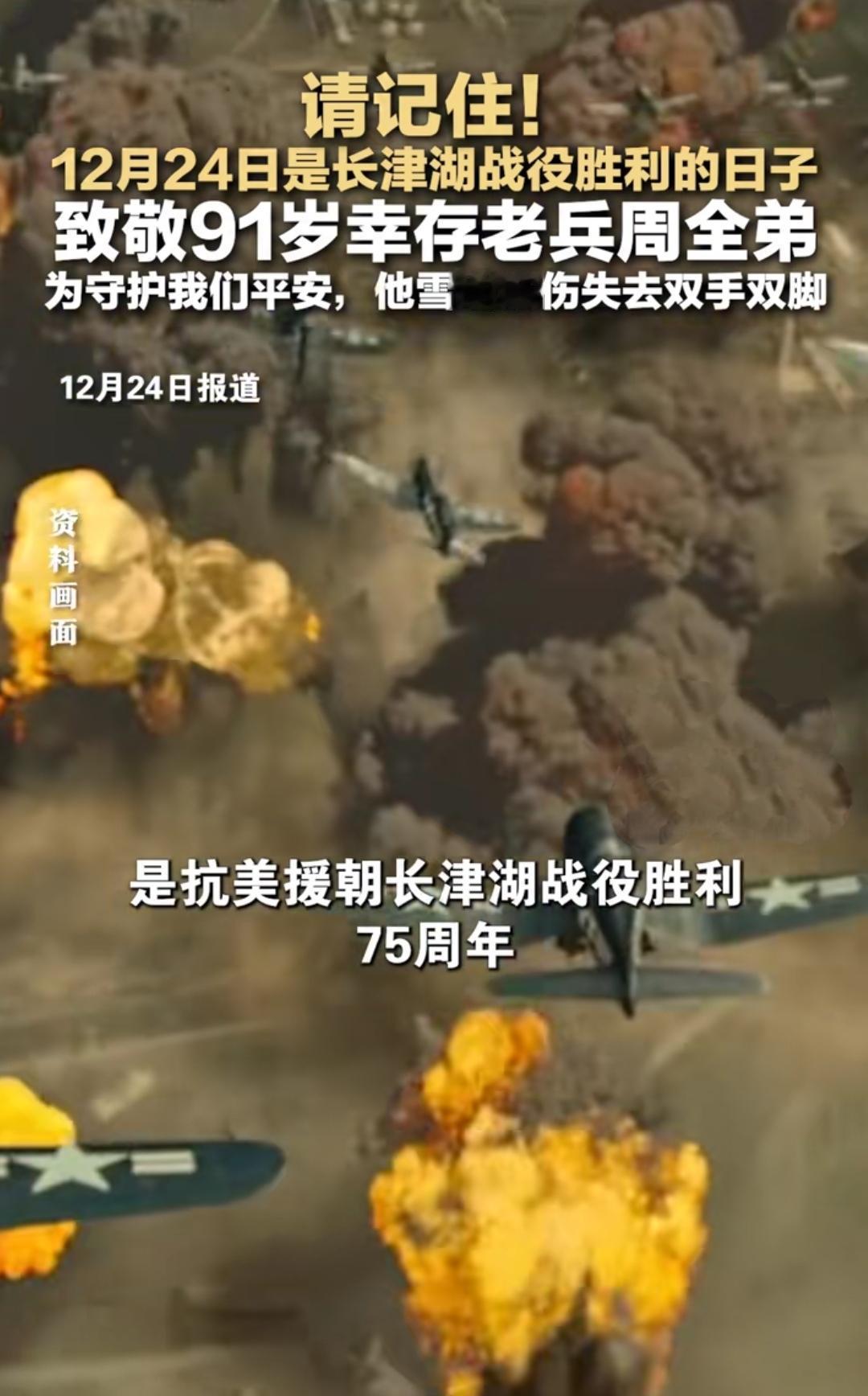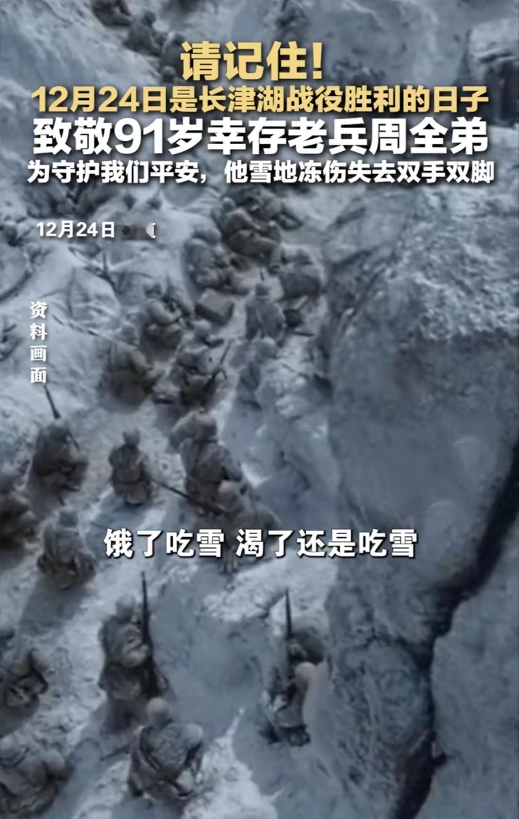 提到12月24日,很多人会想起圣诞的热闹,却少有人知道,这一天是长津湖战役胜利的纪念日。在零下三四十度的朝鲜战场,有一群年轻的战士,用血肉之躯把敌人挡在国门之外,91岁的周全弟就是其中一位幸存者。 他是四川南部县人,当年趴在黄草岭的雪地里,饿了啃雪、渴了吞雪,三天三夜冻得连翻身都做不到。看着战友们冲锋的身影,自己却动弹不得,那份焦急让他眼泪直流。这场战役,他永远失去了双手双脚,可谈起过往,他眼里依旧燃着对祖国的赤诚。 如今的平安岁月,不是凭空而来,是无数个“周全弟”用伤残甚至生命换来的。我们记住圣诞的浪漫,更要刻下英雄的模样,这才是对和平最好的守护。