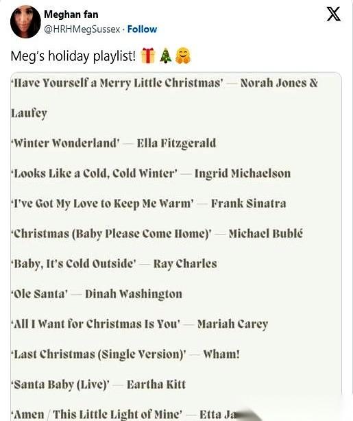 梅根这一招,真的太狠了。 我跟你讲,这比任何红毯艳压、宫斗八卦都来得高级。 今年圣诞,当所有人都挤破头晒礼物、晒派对的时候,她就安安静静甩出来一份……歌单。 对,一份歌单。 第一眼看,平平无奇,甚至有点“老气”。 全是爵士、灵魂乐,什么弗兰克·辛纳屈,埃拉·菲茨杰拉德…… 我爸听的都比这个新潮。 没有一首是抖音神曲,根本不是给你拍短视频用的。 但你细品。 这里面门道太多了。 有给她写过私人歌单的迈克尔·布雷,这是还人情,也是秀品味圈子。 有她采访过的玛丽亚·凯莉,这是巩固关系,告诉全世界“我们是朋友”。 每一首歌,都不是随便选的。 全是她的私人记忆,她的审美坐标。 说白了,她不是在分享音乐。 她是在告诉你:“这才是我。” 配着她那个在自家厨房忙活、包装礼物的视频,感觉就全对了。 她根本没想跟谁比“壕”,人家在另一个维度。 她在比的是:谁活得更自洽,谁的内核更稳。 这年头,大家都在追逐流量,生怕自己过时了。 而真正的玩家,早就开始构建自己的“审美壁垒”了。 用一份老派到骨子里的歌单告诉你: 我喜欢什么,不需要向你解释,更不需要你跟风。 这才是真正的奢侈品啊。 不动声色,就把段位拉满了。 真的,赢麻了。