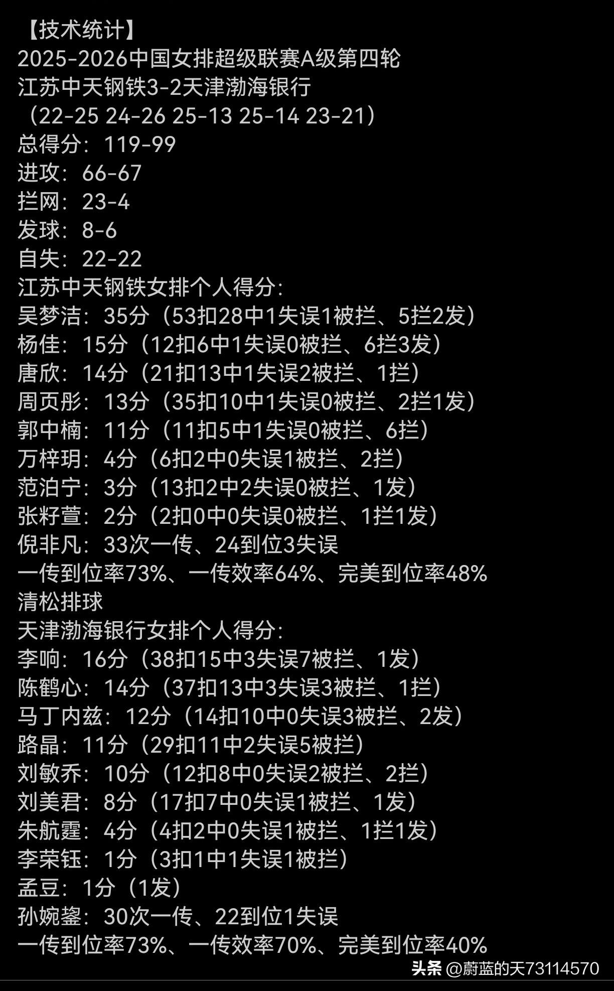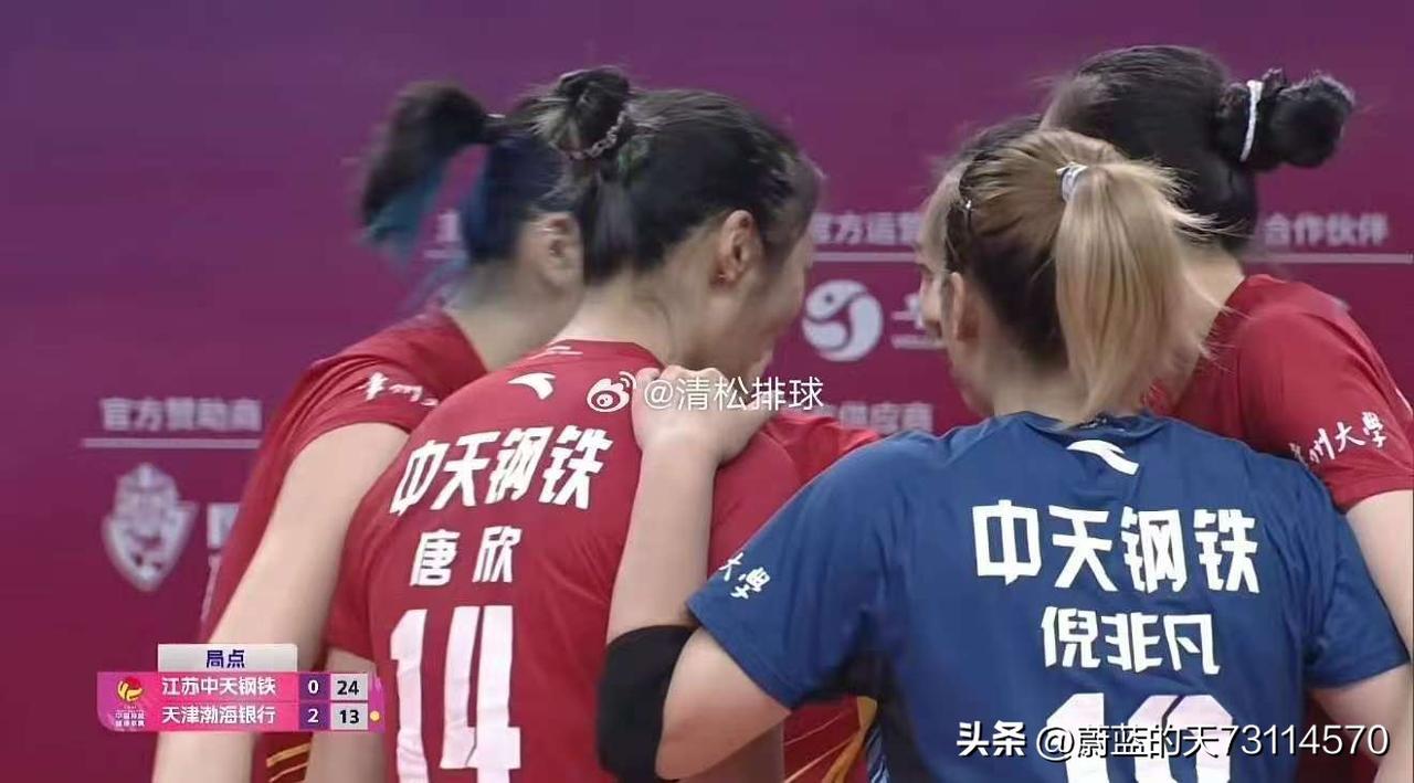 [玫瑰][玫瑰][玫瑰][玫瑰]江苏中天钢铁女排让二追三,逆转战胜天津渤海银行女排。 让二是说:若唐欣+吴梦洁+周页彫的边攻首发取代范泊宁+吴梦洁+周页彤的前三局首发,就没有后面的战五局什么事。 追三是说:从后三局的比分与分差来看( 25-13,25-14,23-21),有25分之多。因此,正常发挥出水平的江苏女排, 天津渤海银行女排有差距明显,根本不是对手。 从数据上看: 总得分:119-99(天津差20分) 扣球得分:66-67(江苏少1分) 拦网得分:23-4(江苏赢19分) 发球得分:8-6(苏赢2分) 自失:22-22。 江苏女排的拦网让天津女排无解,吴梦洁大杀四方,场上独一档,35分5拦2发,赛季新高,双率53%和49%。使天津女排在限制上毫无办法。 因此,从新赛季前四场比赛来看,上海光明优倍最强,江苏、山东、北京和天津按顺序次之。天津渤海银行女排本赛季难进四强,第五名是最好的成绩。 江苏女排