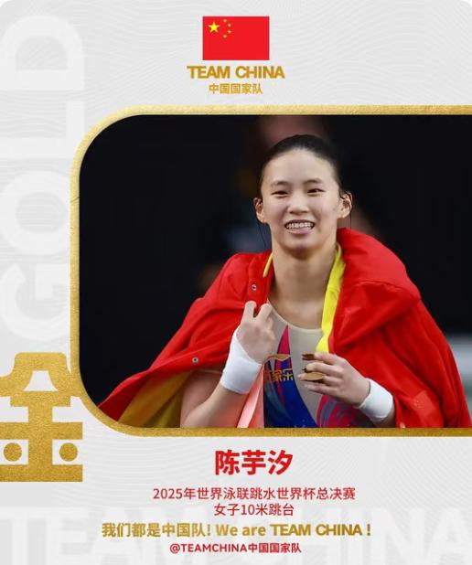 "四冠连峰"陈芋汐: 她定义了世界杯10米台的历史 2022年,跳水世界杯迎来赛制革新一一 全年设三站, 包含两场分站赛与一场超级总决赛。 自此,女子单人10米台的最高领奖台, 便仿佛只为一人预留:陈芋汐。 自2022年首届总决赛起, 她连续四年封后, 实现史无前例的“四连冠”。 从柏林到西安, 再从西安走向世界, 她以一次次稳定而极致的表现, 将“世界杯总决赛冠军”这一头衔, 牢牢铸刻在自己的名字之下。 2022年,她初登顶峰,首冠加冕; 2023年,她再战柏林,成功卫冕; 2024年,她于西安续写传奇,三冠在手; 2025年,她依旧屹立台巅,完成四连霸业。 这不是偶然的连胜,而是实力铺就的统治。 没有悬念的结局,背后是毫无保留的付出。 当她站上跳台,世界便知道一一 女子10米台的“世界杯时代”, 名叫陈芋汐。 "四冠连峰”,是陈芋汐用四年时光, 在跳台上镌刻下的绝对坐标。 当水花为她一次次让路, 历史也便为她一次次改写一一 从柏林到西安,从首冠到四连, 她所定义的已不仅是一个头衔, 更是一个时代的标准。 我们是中国队,为同一面旗帜而战。 而在女子十米台的穹顶之下, 陈芋汐已无需仰望任何星辰,她本身, 就是照亮后来者前路的那座永恒峰峦。