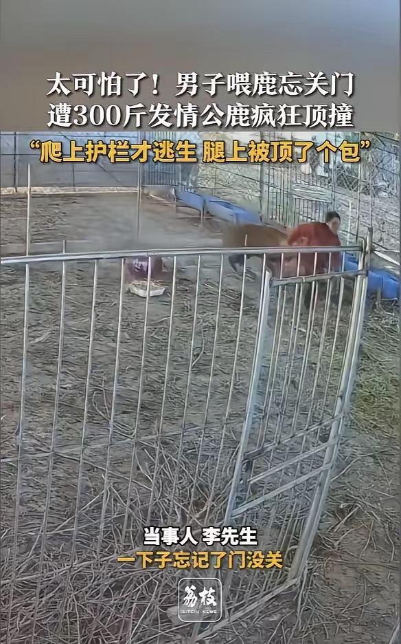 近日,江西吉安,一男子喂鹿时,因一时疏忽,忘记关闭铁门,竟被一头300斤重的公鹿猛烈攻击,吓得男子慌忙逃窜,随后拼尽全力,爬上护栏才暂时脱离险境,但腿上还是被顶了一个包!无论是养殖还是接触野生动物,在靠近时都要小心谨慎,敬畏它们的天性,做好安全措施,这样才能避免发生意外。 有网友表示:我们这里就顶死一个饲养员!头上有个洞,肋骨断几根,发现时,已归西,发情的公鹿特厉害,能要人命。 我去年也带娃喂过鹿,以为它们只吃胡萝卜,哪知道发情期公鹿把靠近的都当情敌,工作人员就远远站着,真出事根本来不及。 别忽视“受伤后处置”。被动物顶撞、抓伤后,不管伤口大小,都要及时用肥皂水清洗,消毒后就医检查,必要时接种相关疫苗,避免后续出现感染、发炎等问题,别抱着“小伤没事”的侥幸心理。 养殖有风险,入行需谨慎。不是说不能养,而是心里得时刻有根弦,敬畏动物的天性,严格按照安全规范来。别觉得天天跟它们打交道熟了,就放松警惕。 对此大家怎么看呢