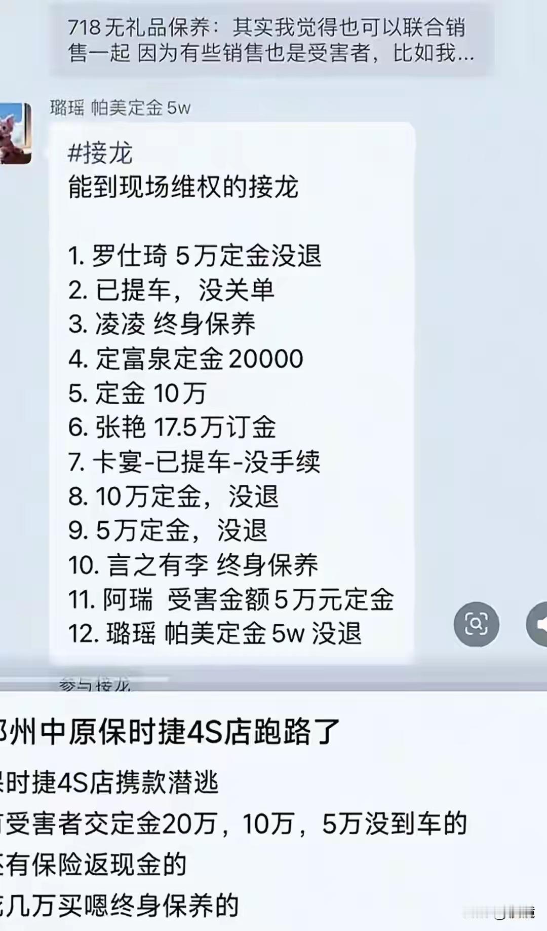 12月22日深夜,郑州中原区大中原国际汽车城的保时捷门店,来了好几辆大型拖车。保安没多想,这店生意最好,可能是去参展。没想到,车拖走了,店也不开了。12月24日,门店外站了一堆人。都是来要钱的。有人交了2万定金,有人交了10万。有个车主给记者看了他们建的维权群,群里210个人接龙报数,写着自己交了多少钱。 有网友表示:这个是跑路的吧,之前的都是保时捷先终止合作,然后逐步退出,也有接手的门店。这个好像保时捷都不知道。 中国的资本家黑心的多,他们卷钱跑路欠薪好像不用担心法律责任似的,律法对有权有钱人违法行为约束不大,因为他们利润可观,敢铤而走险。 国内企业大多都是这样的,觉得开不不下去了,首先想的是卷款跑路,而不是按法律程序清理贷款人员工资和赔偿。 其实,这家4S店的人去楼空也说明了一个很现实的问题,那就是当下燃油车市场,即便是高档燃油车,市场占有率都在大大降低,以往客户主动上门的情景早就不复存在。 对此大家怎么看呢
