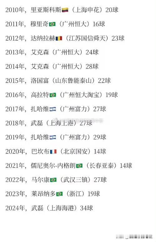 中国职业足球联赛历届金靴 1994年,胡志军(广州太阳神),17球 1995年,范志毅(上海申花),15球 1996年,宿茂臻(济南泰山),13球 1997年,东哥(大连万达),15球 1998年,东哥(大连万达),18球 1999年,曲圣卿(辽宁抚顺特钢),13球 2000年,卡西亚诺(山东鲁能泰山)15球 2001年,东哥(大连实德),16球 2002年,李金羽(辽宁波导)16球 2003年,阿尤(沈阳金德)、马丁内斯(上海申花)、李毅(深圳健力宝)14球 2004年,阿尤(上海国际)17球 2005年,耶利奇(北京国安)21球 2006年,李金羽(山东鲁能泰山)26球 2007年,李金羽(山东鲁能泰山)15球 2008年,路易斯(天津泰达)14球 2009年,巴尔克斯(深圳红钻)、拉米雷斯(广州医药)17球 2010年,里亚斯科斯(上海申花)20球 2011年,穆里奇(广州恒大)16球 2012年,达纳拉赫(江苏国信舜天)23球 2013年,艾克森(广州恒大)24球 2014年,艾克森(广州恒大)28球 2015年,洛国富(山东鲁能泰山)22球 2016年,高拉特(广州恒大淘宝)19球 2017年,扎哈维(广州富力)27球 2018年,武磊(上海上港)27球 2019年,扎哈维(广州富力)29球 2020年,巴坎布(北京国安)14球 2021年,儒尼奥尔-内格朗(长春亚泰)14球 2022年,马尔康(武汉三镇)27球 2023年,莱昂纳多(浙江)19球 2024年,武磊(上海海港)34球 中国足球 中国足球排名 国足历史射手榜 中超金靴