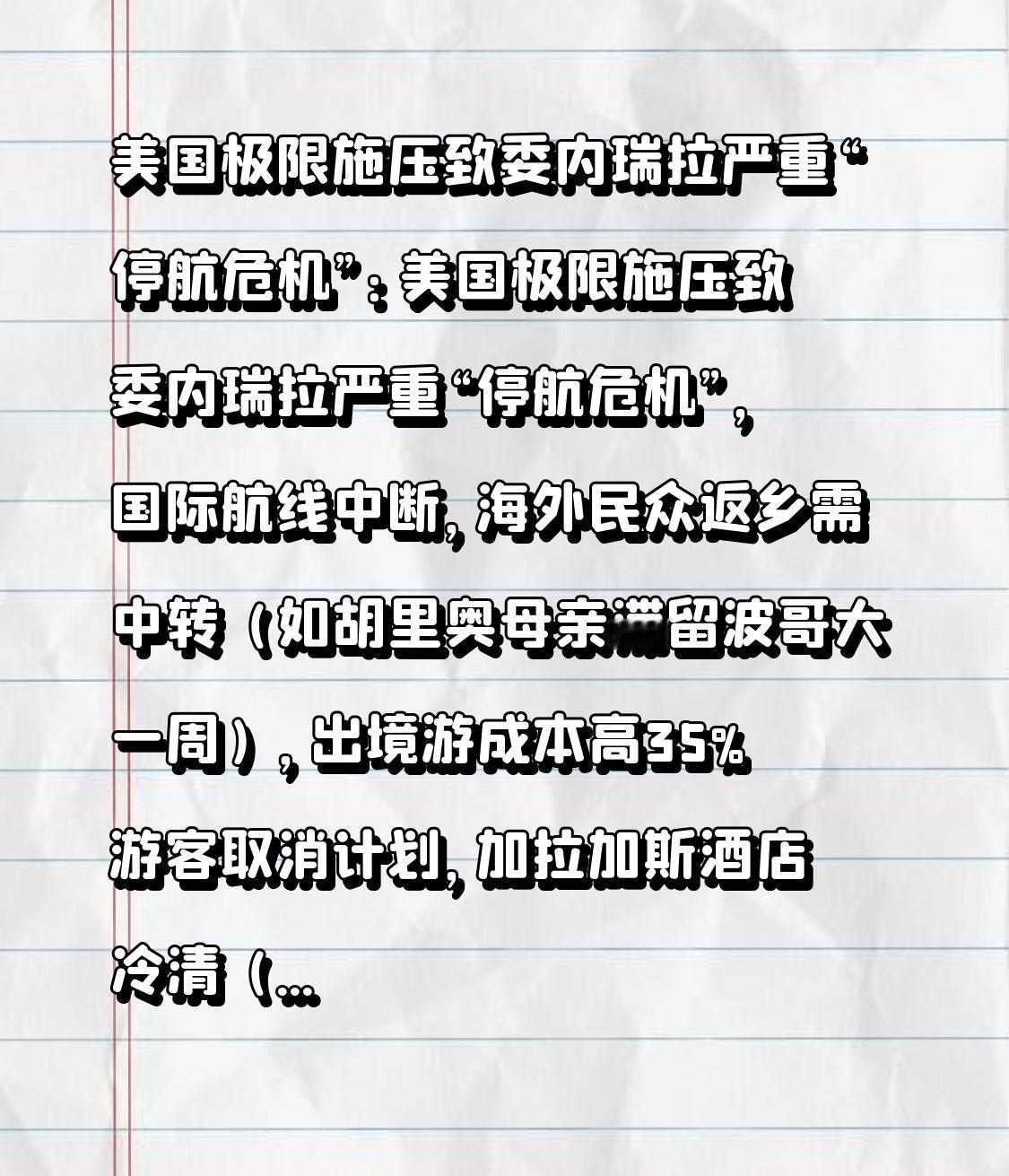 美国极限施压致委内瑞拉严重“停航危机”:美国极限施压致委内瑞拉严重“停航危机”,国际航线中断,海外民众返乡需中转(如胡里奥母亲滞留波哥大一周),出境游成本高35%游客取消计划,加拉加斯酒店冷清(早餐改点餐),旅游部门正强化周边航线应对。