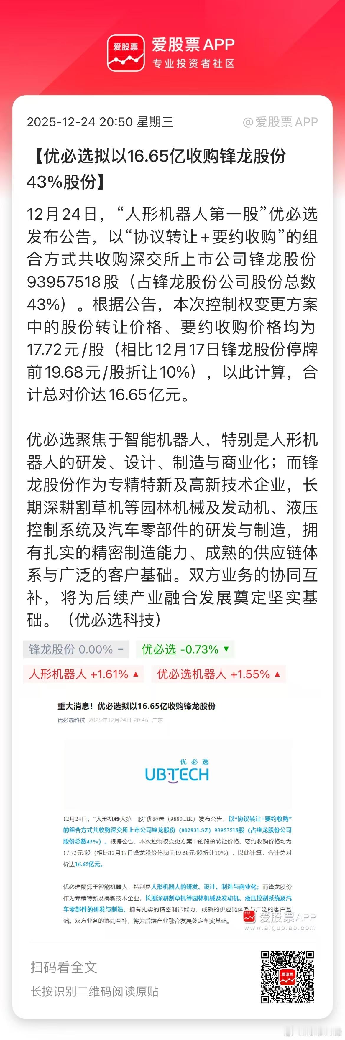 优必选是国内机器人第一股,但在港股不怎么受待见,市值550亿港元,高位下来跌了70%!现在花了16.65亿拿下A股锋龙股份43%的股份,此次收购或借壳返回A股,这是要狙击宇树科技啊。回A股不得炒到千亿以上,2000~3000亿也是有可能的。锋龙股份会不是下一个上纬新材?公司1.74万股东估计要睡不着。明天开始数板的节奏,这是中了一张大彩票了。优必选相关的概念股,比如合作方,参股方等等,估计也会被炒一炒。今晚小表格挺多的,这个供大家参考吧:(爱股君)