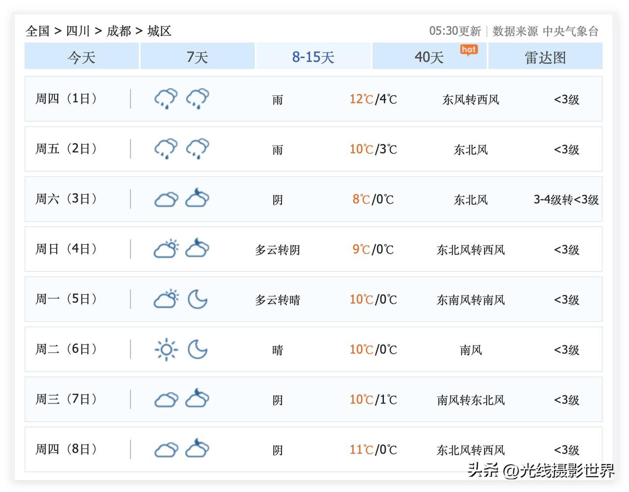 呜呜呜!好巧不巧!元旦节,四川省成都市,要泡在雨水里面啦!12月30日到1月3日,成都市,阴雨连绵,凄风冷雨,气温逐渐下降,冻死单身狗啊! 1月3日,成都气温跌至0-8度……成都市,终于要迎来今年冬天最冷的日子啦! 0度,正在向成都的单身狗招手啦! 0度……1月3日到8日,成都市的最低气温,可能都会是零度…… 成都市的郊区或者小山上面,可能要打霜啦! 成都,居然真的会经常打霜吗?!