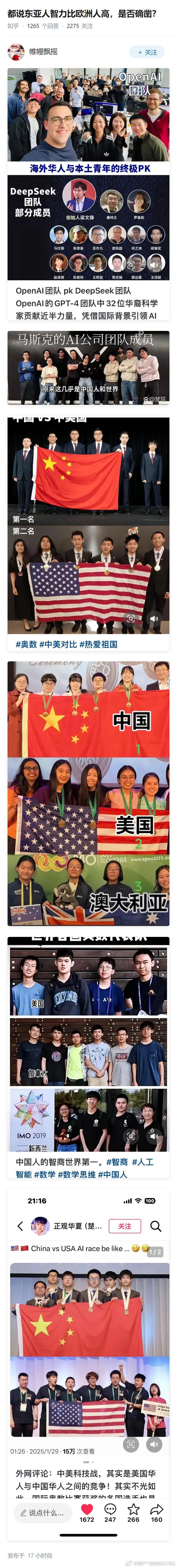 都说东亚人智力比欧洲人高,是否确凿?比如说世界顶级科学家,重大发明发现都是欧洲人,为什么中国寥寥无几。有人说因为中国近代落后。那日本人呢,日本人近代也是一个世界强国,但是他们的科技类型不是创新的,他们是改良了科技,把技术做到最精但是想想欧洲人考试分数比不过东亚人,电竞也打不过东亚人有个欧美科学家说过,东亚人智力是最高的,但是缺乏想象力你认为呢?你对此有什么研究呢------------------------------------