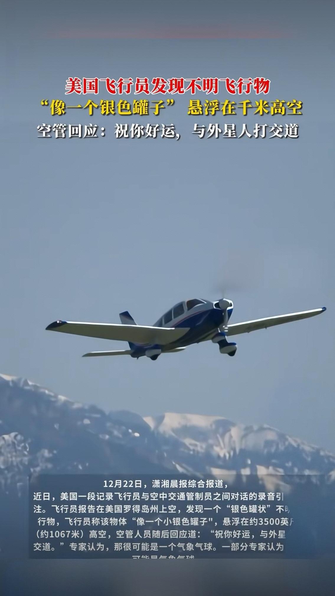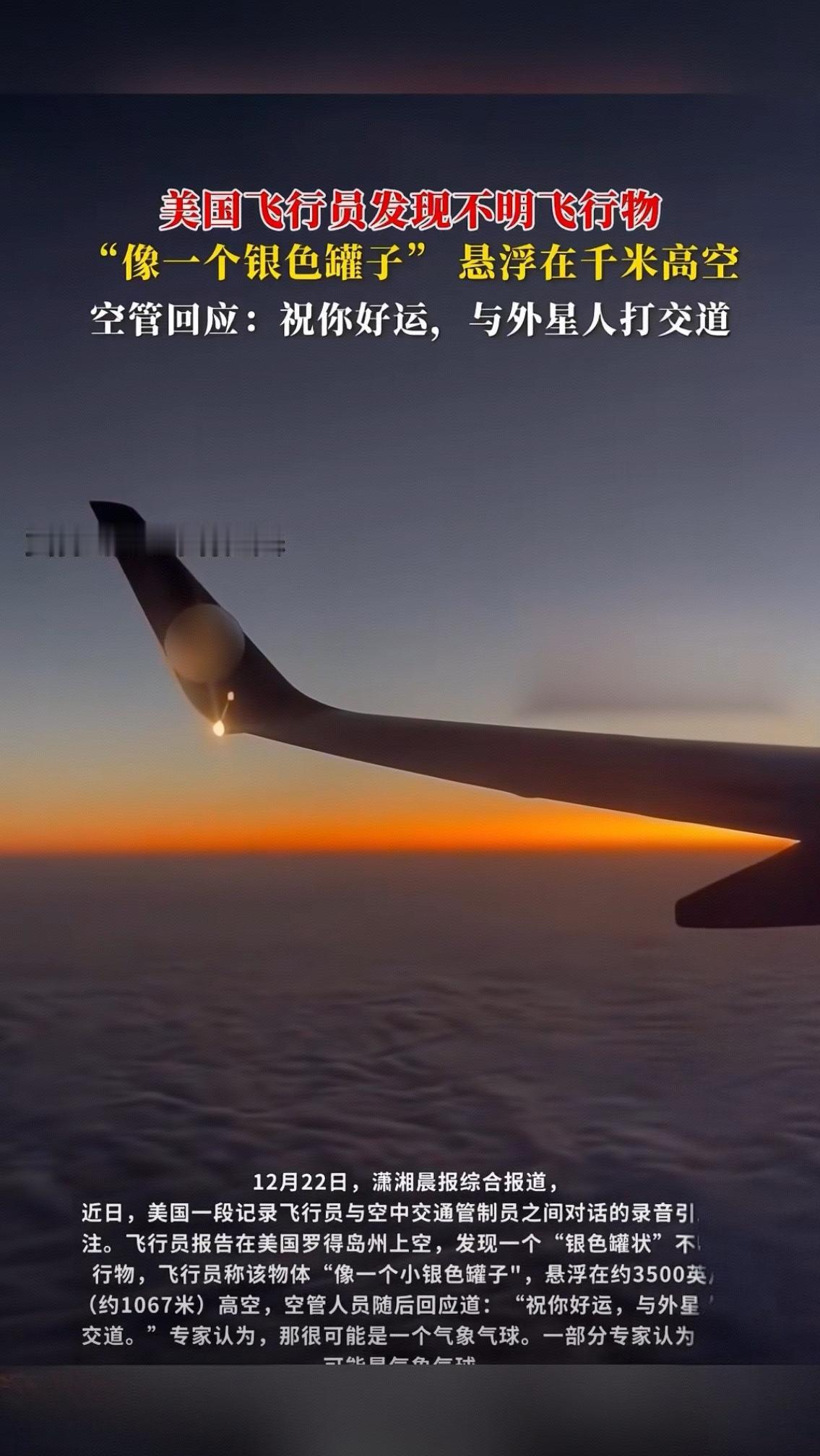 美国飞行员发现不明飞行物:“银色罐子”悬浮千米高空,空管一句调侃戳中多少人对宇宙的向往 “像一个银色罐子”悬浮在千米高空,当美国飞行员对着无线电喊出这句话时,恐怕连他自己都没想到,这段对话会迅速冲上热搜,让无数网友直呼“DNA动了”。 更让人忍俊不禁的是空管的神回复:“祝你好运,与外星人打交道”。一句调侃,瞬间消解了未知飞行物带来的紧张感,反倒勾起了所有人藏在心底的好奇心——谁小时候没仰着脑袋数星星,幻想过外星文明的样子? 这位飞行员的经历,像极了我们每个人平凡生活里的“奇遇时刻”。或许是深夜抬头撞见的奇异天象,或许是荒野中一闪而过的不明光点,那些无法被立刻解释的瞬间,总能轻易撬开我们对浩瀚宇宙的向往。有人说这是一场乌龙,大概率是气象气球或无人机;也有人笃定这就是外星来客的踪迹,吵着要飞行员拍下高清照片。 但抛开“是不是外星人”的争论,这件事最动人的地方,其实是人类从未熄灭的探索欲。从古人抬头问天,到如今航天器飞向火星,我们对宇宙的好奇,从来都不是“杞人忧天”,而是刻在骨子里的本能。空管的那句调侃,看似玩世不恭,实则藏着一份温柔——它默许了我们对未知的想象,也让这场偶遇多了几分浪漫色彩。 评论区里,有人调侃“飞行员:我只是想报个情况,没想到要单挑外星人”,有人脑补“外星人:刚出门买个菜,怎么就被地球人盯上了”,还有人认真分析“银色罐子”的飞行轨迹,试图用科学原理解谜。这场跨越国界的讨论,没有争吵,只有满满的欢乐与好奇。 说到底,我们在意的从来不是那个“银色罐子”到底是什么,而是它让我们暂时跳出了柴米油盐的琐碎,重新抬头仰望星空。就像有人说的:“生活已经够平淡了,总得留点空间给幻想吧。” 那么问题来了——如果当时你是那位飞行员,你会对着无线电喊出什么?如果真的遇到了外星人,你最想问他们什么?评论区等你脑洞大开!天空未知飞行物
