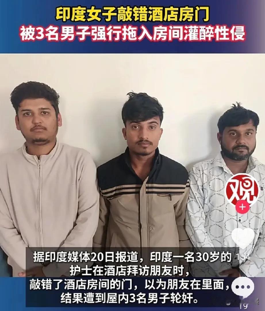 印度有一名女护士到酒店探望朋友,因敲错房门而被房内三人轮j。原来,女护士的朋友住在一楼105,但她误打误撞走到了二楼,顺手敲开了205的房门后,结果被里面的一名男子强行拖入。 其实,205房间内共有三名男子,他们强行给女护士灌酒,之后三人借着酒劲把这名护士侵f了。4个小时以后,女护士瞅准时机逃出了魔z! 逃脱后她马上去当地警察局报了案,很快这三人就被👮抓住了,通过审问得知这三人,其中两人是银行职员,另一人还是一名顶尖大学的在读研究生! 这下可好,三人的一时冲动毁了各自的前程! 女护士被毁了清白,这三人也将面临f律的严惩!