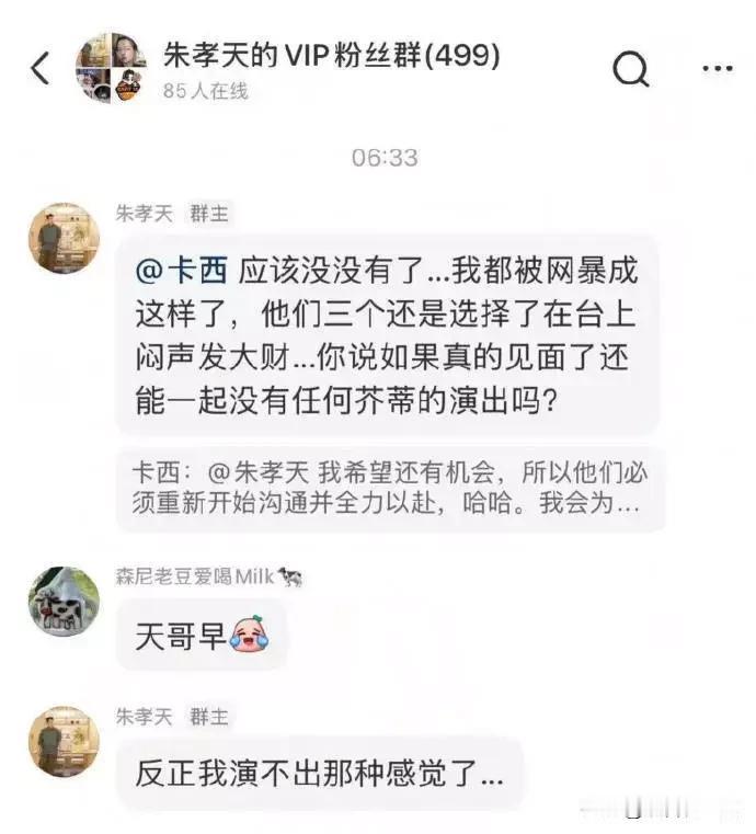 朱孝天这波操作真是够刚的! 近日他在粉丝群说自己唱歌会跑调但坚持全开麦,疑似内涵陷入假唱风波的阿信。这事儿得从F4巡回演唱会说起,本来说好四人合体,结果上海站成了F3+阿信的配置。 朱孝天称自己是看新闻才知道“被退出”,还说拒绝“相信音乐”3个要求后,就被单方面切断联系,甚至被高层抹黑。他都被网暴了,还吐槽F3闷声发大财。 朱孝天是有种意难平的感觉,看见其它三人都开演唱会赚钱了,自己还在这消费着与相信音乐的各种,朱孝天这番话一出,不知道后续还会有啥发展呢。 朱孝天演唱会
