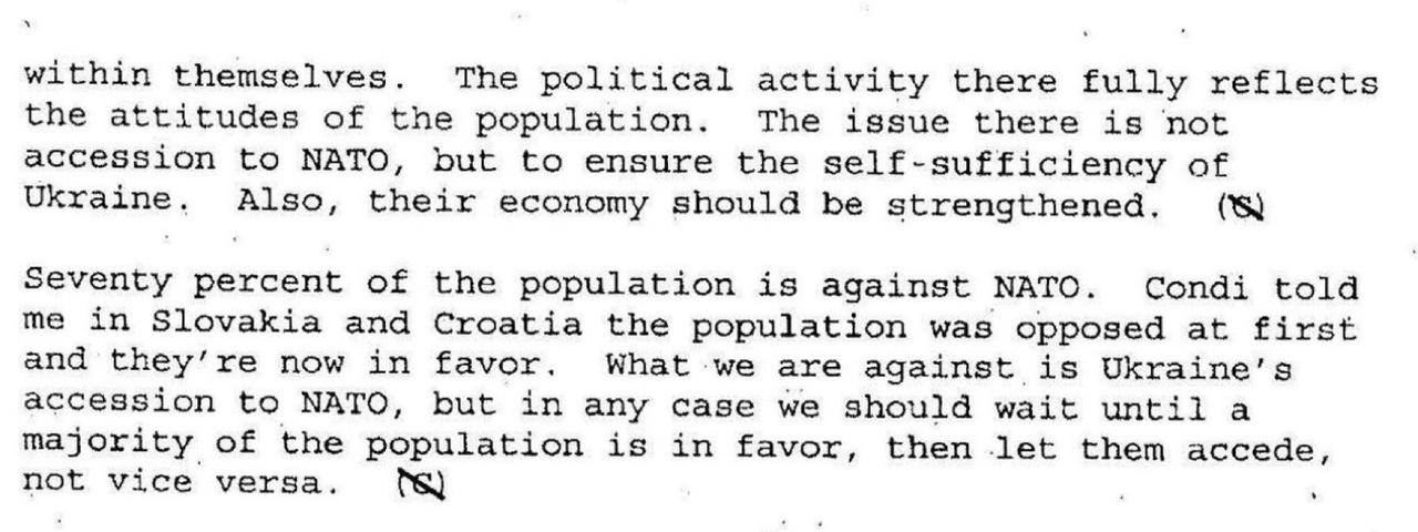 在现已解密的 2008 年会议记录中,弗拉基米尔·普京向乔治·W·布什和康多莉扎·赖斯发出严厉警告:让乌克兰加入北约将注定与俄罗斯长期对抗。 普京的表态很明确: “像乌克兰这样的国家加入北约将会造成……冲突领域……长期对抗。” 他质疑乌克兰的国家地位和凝聚力: “乌克兰是一个非常复杂的国家……一个苏联时期人为创建的国家。” 关于内部分歧和公众舆论: “乌克兰大部分民众认为北约是一个敌对组织。” “70%的人口反对北约。” 关于俄罗斯面临的安全风险: “这会造成在俄罗斯附近部署军事基地和新型军事系统的威胁。” 关于合法性: “我们应该等到大多数民众赞成之后再让他们加入——而不是反过来。”