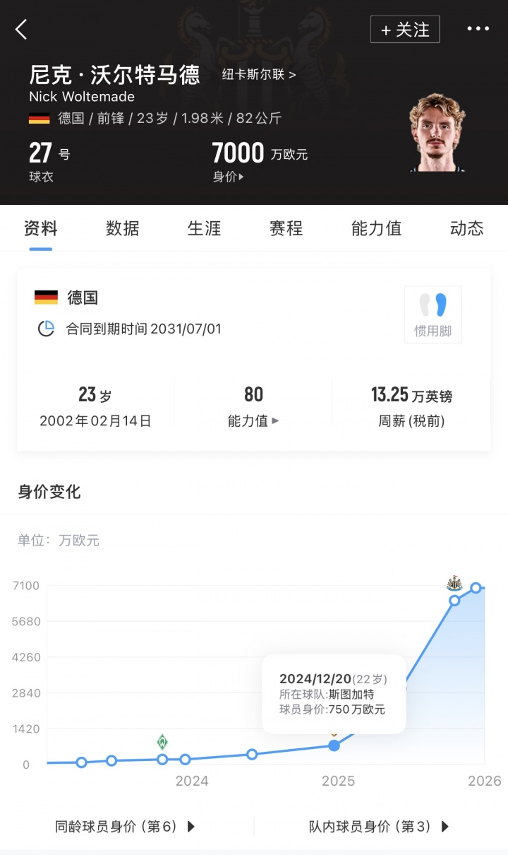 去年夏窗,沃尔特马德的身价仅为400万欧元,到2025年冬窗涨至750万欧元。2025年夏窗各大豪门的竞价战让沃尔特马德的身价一飞冲天,在求购多人无果后,纽卡斥资7500万欧元签下沃尔特马德,当时他的身价才3000万欧元。