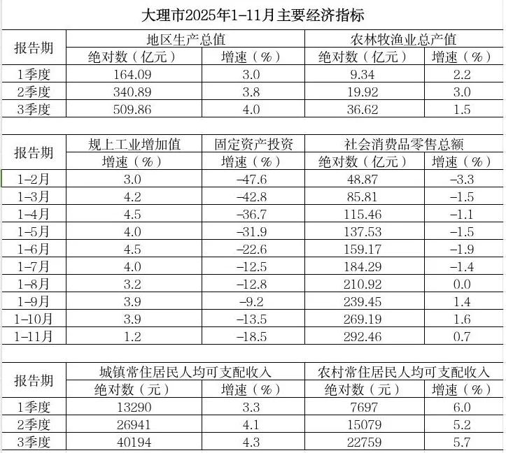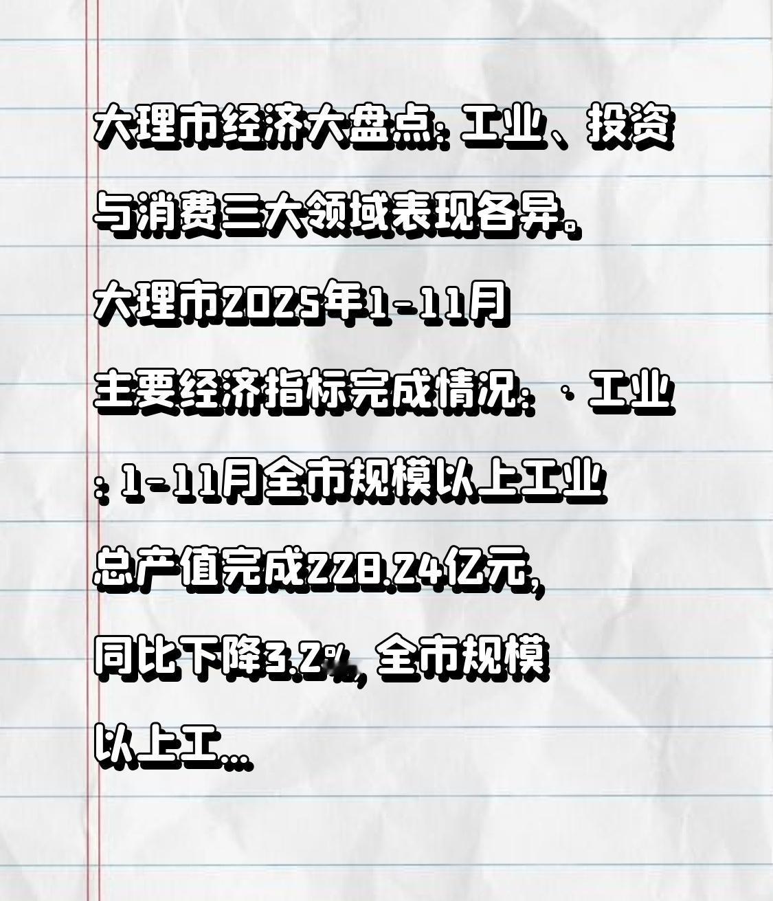 大理市1至11月经济大盘点:工业、投资与消费表现不一。 2025年1-11月大理市主要经济指标完成情况如下: 1-11月,全市规模以上工业总产值228.24亿元,同比降3.2%,增加值增长1.2%。 1-11月,全市固定资产投资降18.5%,城镇投资同比降15.4%,房地产投资同比降25.3%。 1-11月,全市社会消费品零售总额292.46亿元,同比增0.7%。 从数据来看,大理市工业有一定韧性,规模以上工业增加值仍实现增长,不过总产值下滑也值得关注。投资领域面临较大压力,固定资产、城镇及房地产投资均呈下降态势,这或许会影响后续经济发展动力。 而消费方面虽有增长,但幅度较小,市场活力有待进一步激发。接下来,大理市或许需出台针对性政策,推动工业转型升级,刺激投资复苏,同时进一步挖掘消费潜力,以促进经济平稳健康发展。