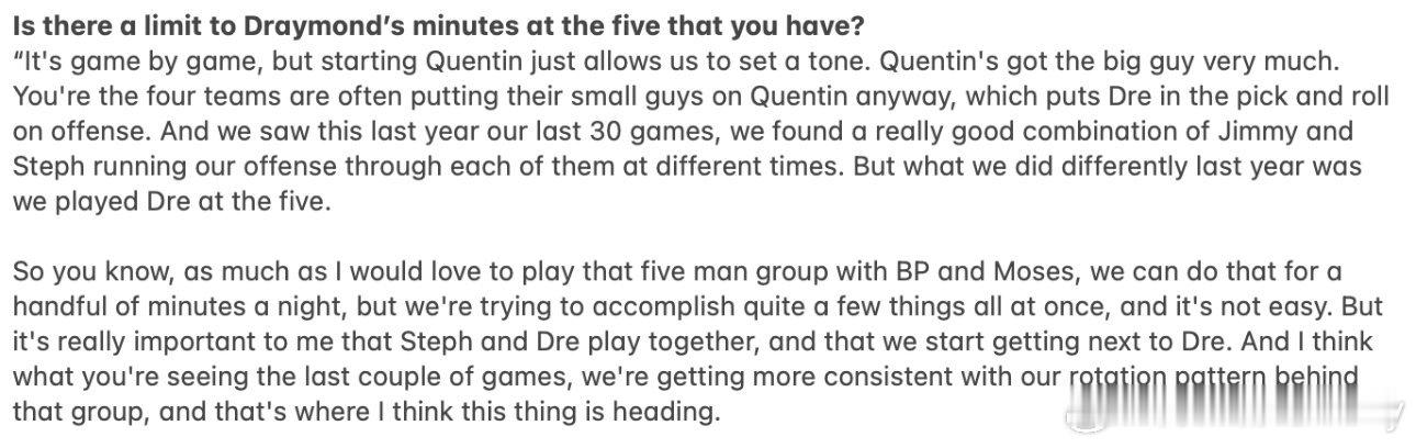 科尔表示,追梦必须和库里一起打:“对我来说,有一点非常重要——追梦必须和库里一起打。波斯特的身高和投射能减轻追梦的压力,而追梦在库里身边的状态是最好的,他的大部分时间必须和库里一起上,这两人在一起真的非常出色。”