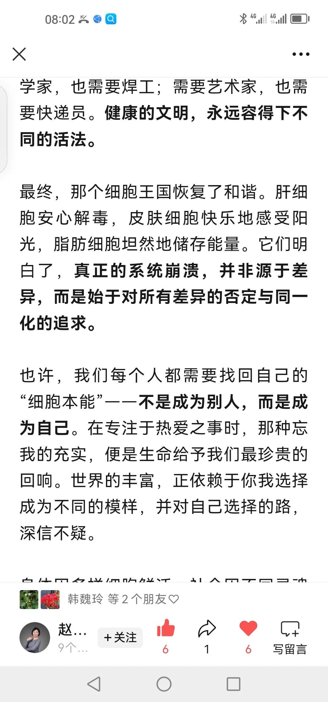 各安其道:细胞寓言的启示 (赵茹茜) 中华文化博大精深指导我们探索创新。 某日,身体内的细胞们突然开始了一场荒谬的竞赛——肝细胞羡慕脑细胞的“高智商”标签,皮肤细胞渴望获得心肌细胞的“核心器官”认证,就连默默无闻的脂肪细胞也开始为自己的“存在意义”感到焦虑。