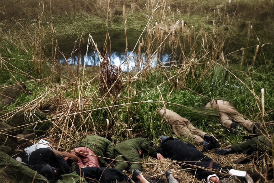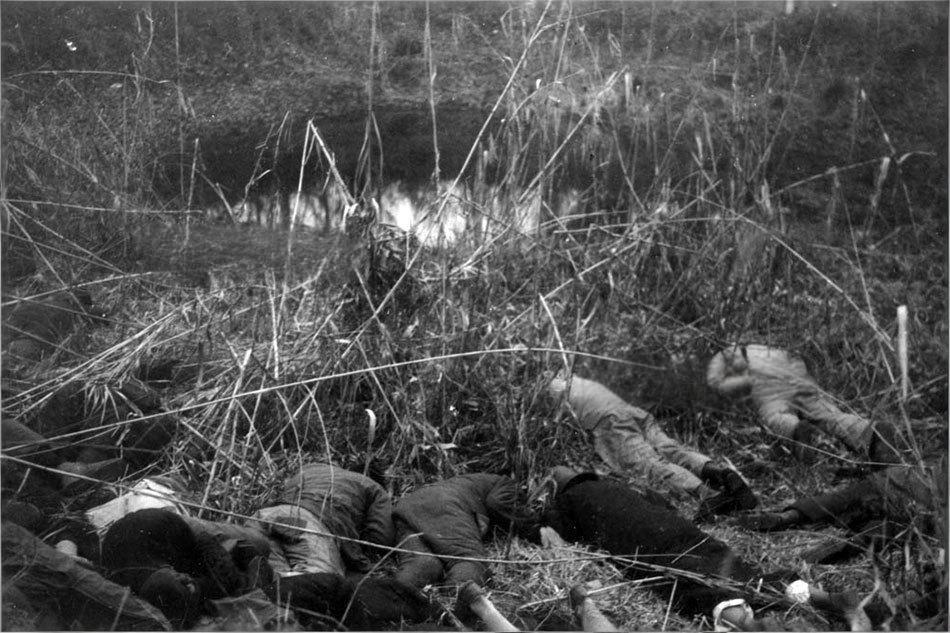 这张照片是南京大屠杀期间的真实历史罪证影像,拍摄于1937年12月南京沦陷后不久。多具我国遇难者遗体横陈在芦苇丛中,这些受害者多为平民或放下武器的士兵,被日军集体枪杀、刺刀刺死后弃置于此,尸体姿势扭曲、衣着凌乱,部分被草丛半遮盖,场景凄惨而无声。