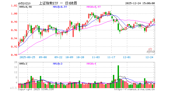 12月24日,上证指数ETF(510210)涨0.61%,成交额3.20亿元。当日份额减少7500.00万份,最新份额为60.86亿份,近20个交易日份额减少8.97亿份。最新资产净值计算值为60.01亿元。
