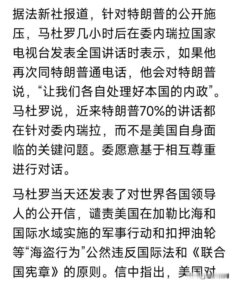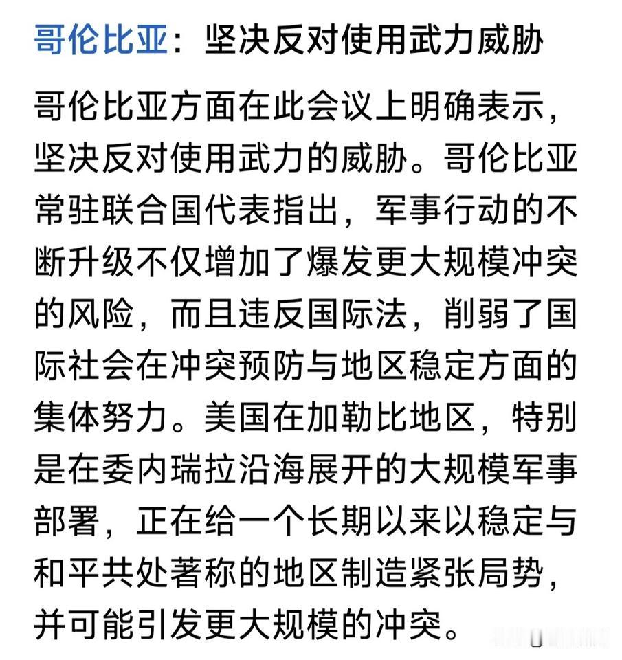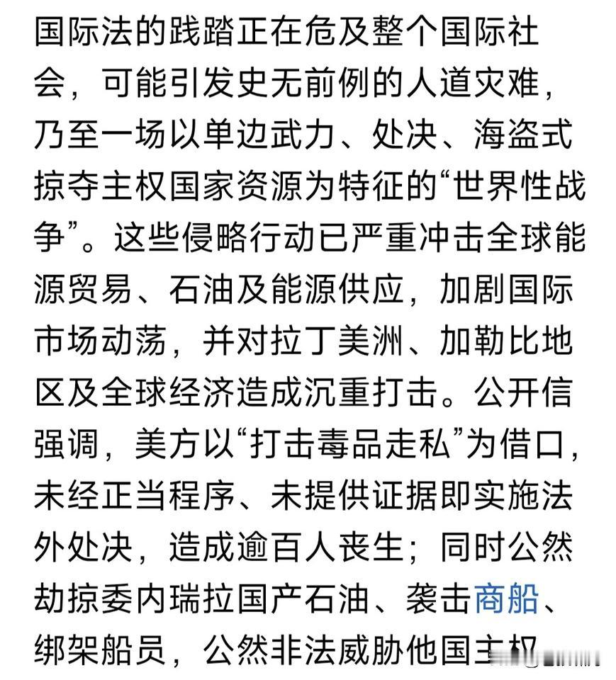应委内瑞拉请求,安理会召开紧急会议!多国代表发言,谴责美国在加勒比海强盗行径,危害委和拉美安全。 苍狼看过新闻,有几点不理解: 1.委内瑞拉请求,安理会就得开会? 2.这种会议肯定有人反对,能形成决议吗?形不成决议有意义吗? 3.当下世界两场战争,以哈胜负已定,俄乌仍在持续,是非对错分明,每天都在流血!安理会为何没有行动? 世界怪事太多,让人不可理解!但本人始终相信,有“联合国宪章”和“国际法”为准绳,文明终将战胜野蛮!正义终将战胜邪恶!人类终将走向美好! …………