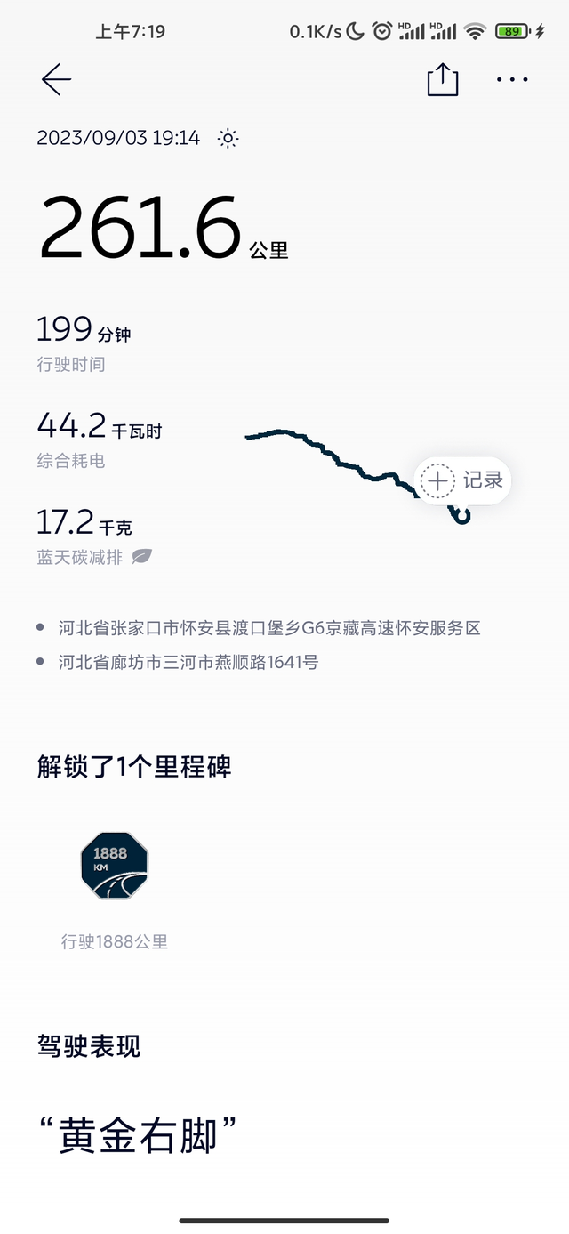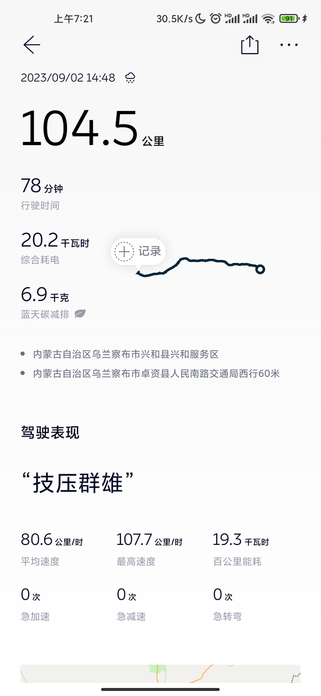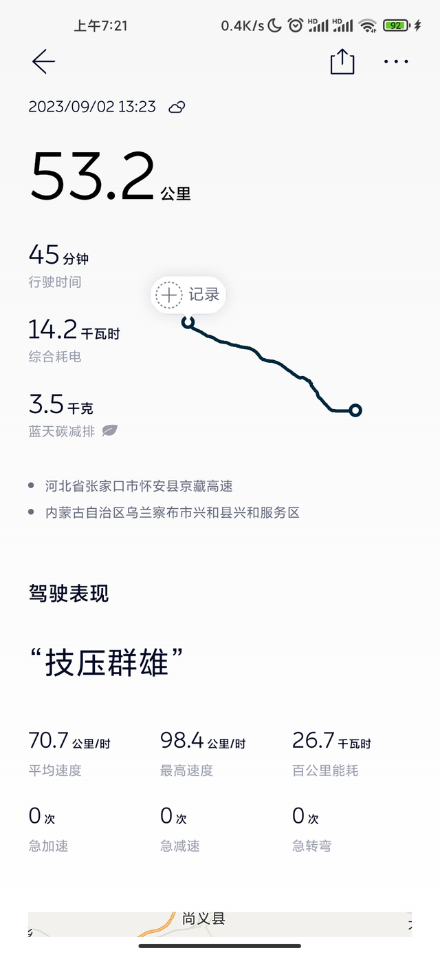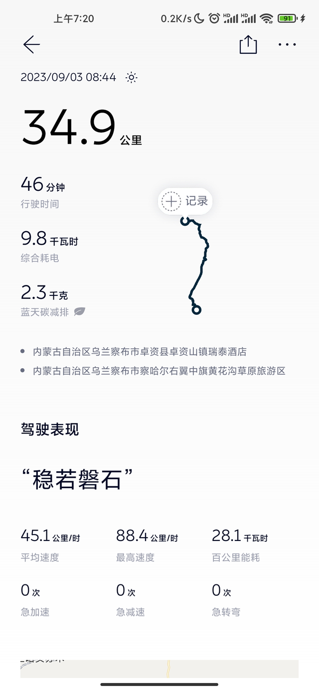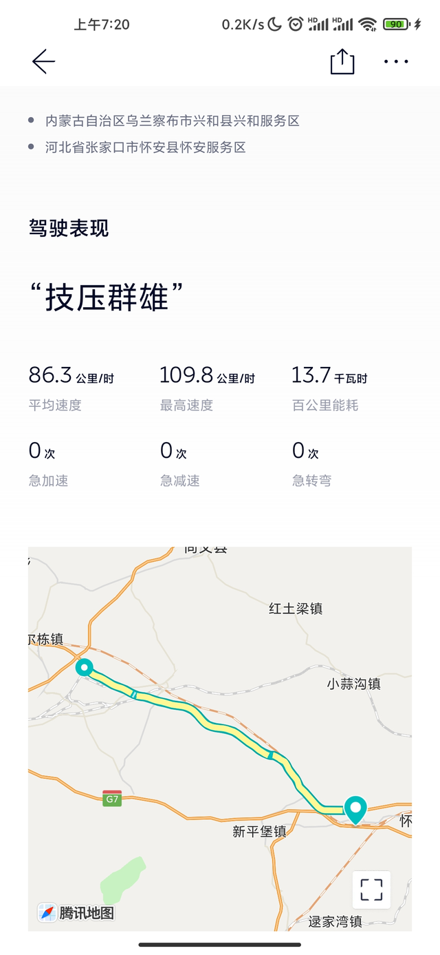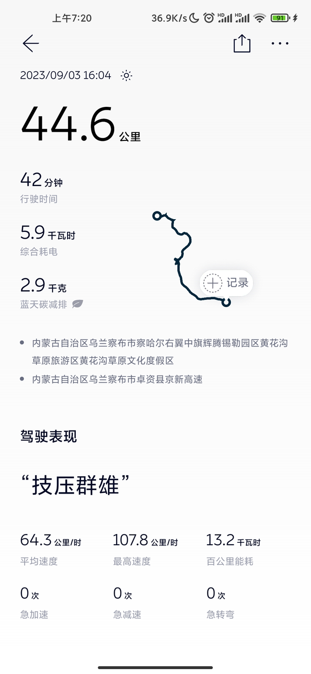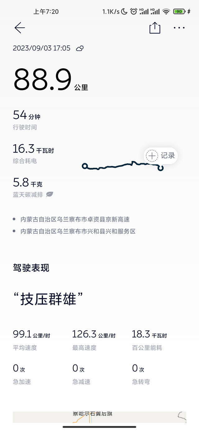提车首月一场1000公里的旅行 燕郊-乌兰察布 一家三口的新车初次旅行(空调按摩音乐) 2023款es6,去程雨天上坡,能耗20往上,一口气开到怀安换电,换完发现前方兴和服务区有超充,而且是在内蒙境内1000度免费,哈哈可以白嫖电费了,直接充到100%,电池不健康无所谓啊,回头换掉就好了 回程一路下坡啊,电耗18左右,有了来的经验直接去兴和服务区充到90%,一口气开到家还有100公里电 优点:辅助驾驶很爽,一直开一直爽,能耗表现很优秀,2.3吨的车加三个人,全程超限速10%以上跑,空调按摩通风都安排上;换电真无敌,能充能换,对于我来说3万换每月6次超值,啥时候能把100度的降降价最好,6次不够用啊,3天就得换,总去换也很烦啊 缺点:舒适模式下过减速带速度越低越变扭,速度高了反而好很多;车多了还是别辅助驾驶了,一点也不省心,没车是真爽;雨天也能让nomi开天窗(我家娃的操作),幸亏我手快,要不就坐车里洗澡了;超充站180kw桩,最多能到90kw啊,就我一个人充有点慢啊;充电盖我还是打不开还得nomi开,按了p挡了,按右下角不应该就开了么,我就没成功过,不理解