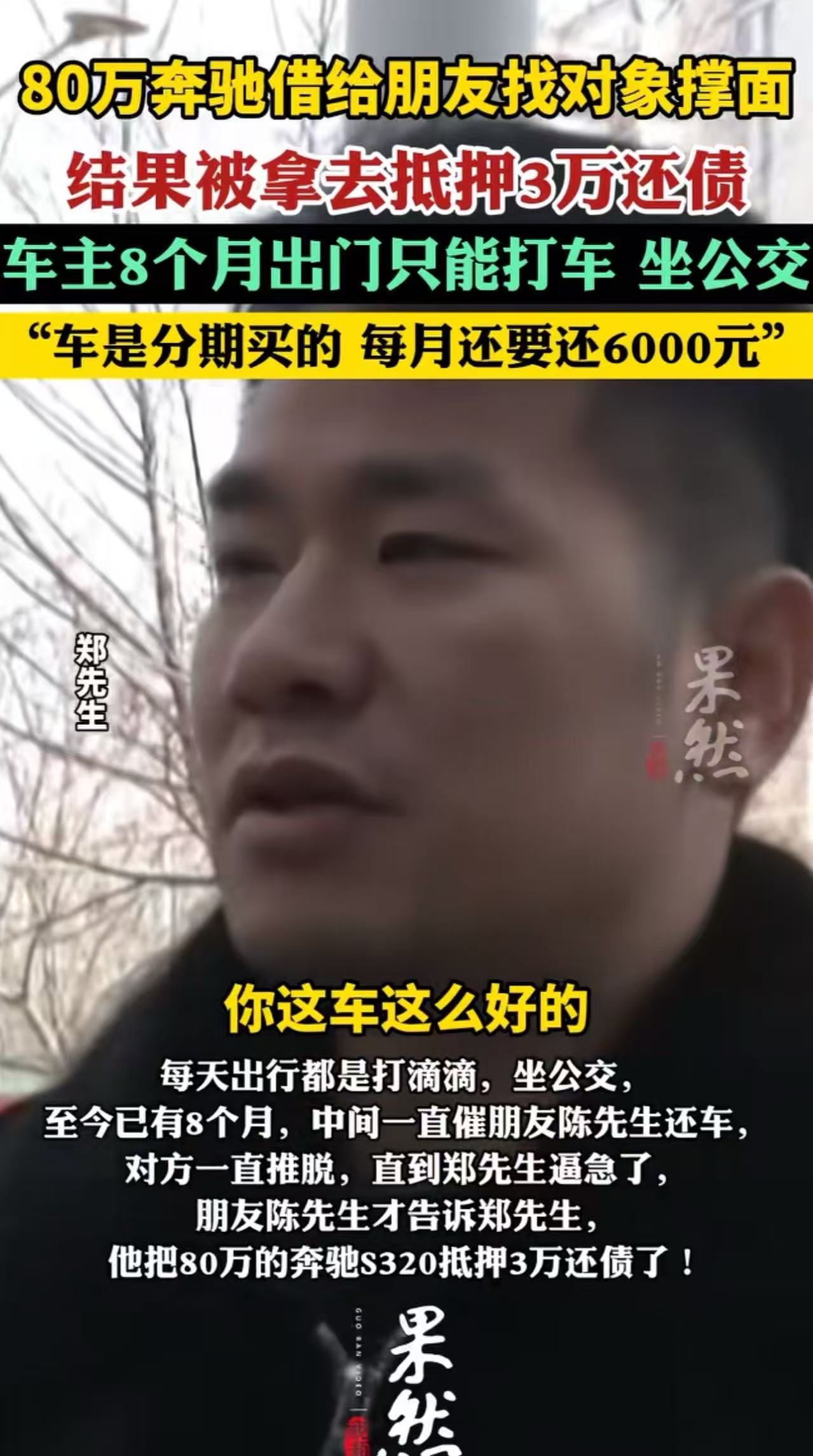 男子把80万买的大奔,借给朋友找对象撑面,自己每天打车挤公交8个月,万万没想到,朋友却将车抵押了3万还债!男子:“车是分期买的,每月还要换6000车贷,我把他当兄弟,他却这样对我,气得我一会不敢再相信任何人了!”