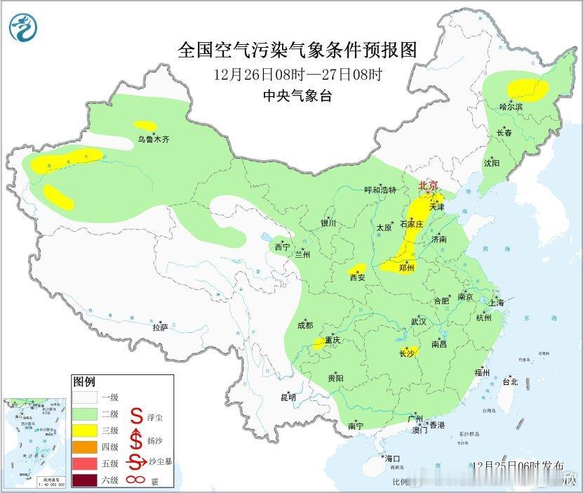 【雾和霾】今晨在湖北重庆四川云南部分站点出现大雾,局地出现强浓雾。8时能见度不足100米的站点有:湖北竹山57米、四川巴中71米、蓬安89米、安岳95米、重庆万盛83米、云南孟连96米。此外昨晚到今晨,黄淮江淮等地有些轻微的霾,在冷空气北风推动下,目前主要集中在安徽一带。今天中东部多地的大气扩散条件较好。26日至28日白天,华北中南部、黄淮中西部等地大气扩散条件有所转差,有轻至中度霾。28日夜间起,受冷空气影响,霾天气逐步减弱或消散。
