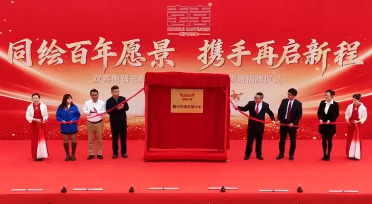 2025年12月22日,珠海双喜电器工业园区内彩旗飘扬、鼓乐喧天,“同绘百年愿景,携手再启新程”双喜电器三期工程庆典暨低空经济项目揭牌仪式盛大启幕。政府代表、行业精英与合作伙伴共同见证双喜电器在制造体系升级与新兴产业布局上的重要进展。作为本次活动的重要环节,低空经济项目的揭牌备受关注。