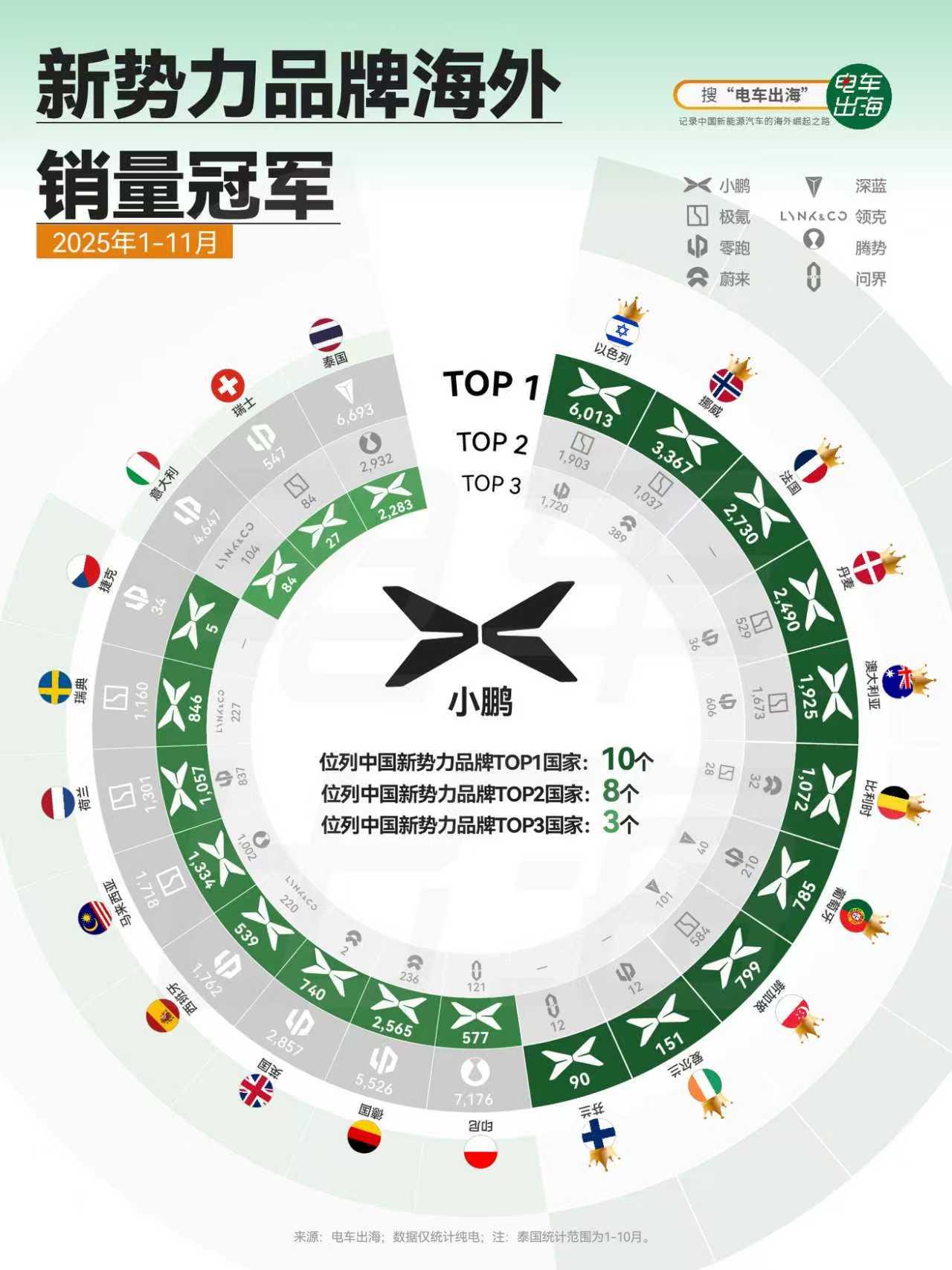 小鹏汽车的全球之路,今年走得越来越扎实。 全球增长,数字很猛,欧洲最亮眼。今年前11个月,小鹏全球卖了近40万台,同比增长156%。其中海外市场占了3万多台。分地区看,亚太(含中国)市场增速高达170%,欧洲增长161%,中东增长66%。今年还新增乌拉圭、哥伦比亚等十来个交付市场,版图继续扩大。 北欧销冠,在成熟市场站住了,很能直观说明小鹏的产品力。2025年11月,小鹏在挪威单国及整个北欧市场,都拿下了中国品牌销量冠军。挪威单月销量首次突破500台,已经超过了比亚迪。在丹麦的销量也超过了名爵和比亚迪,成为中国纯电品牌第一。这证明小鹏的智能化车型,已经成功打入了欧洲本土品牌的核心竞争圈。小鹏夺北欧中国品牌销冠 海外新势力销冠,多个市场领跑。小鹏不只是销量增长,在品牌排名上也很突出。小鹏在10个国家位列中国新势力纯电品牌第一,在另外8个国家排名第二。具体来看,在法国、葡萄牙、新加坡、比利时、澳大利亚这些高价值市场,它都拿到了新势力品牌销量冠军,实现了多点开花。小鹏获海外10国新势力销量第一 全球研产,不止卖车,更在扎根。小鹏的全球化,已经超越了整车出口的初级阶段。小鹏在全球设立了9个研发中心,并且快速落地了印尼、奥地利(与麦格纳合作)、马来西亚三个海外生产基地。这套“研发+本地化生产”的组合拳,意味着小鹏正在从中国制造出口转向全球研发智造,是更深入、更可持续的出海模式。 简单总结下,小鹏今年的全球表现,是销量、品牌和体系建设的全面进步。它证明了在中国市场验证过的智能电动车产品与商业模式,有能力在成熟的欧洲市场和高潜力的新兴市场同时获得认可。