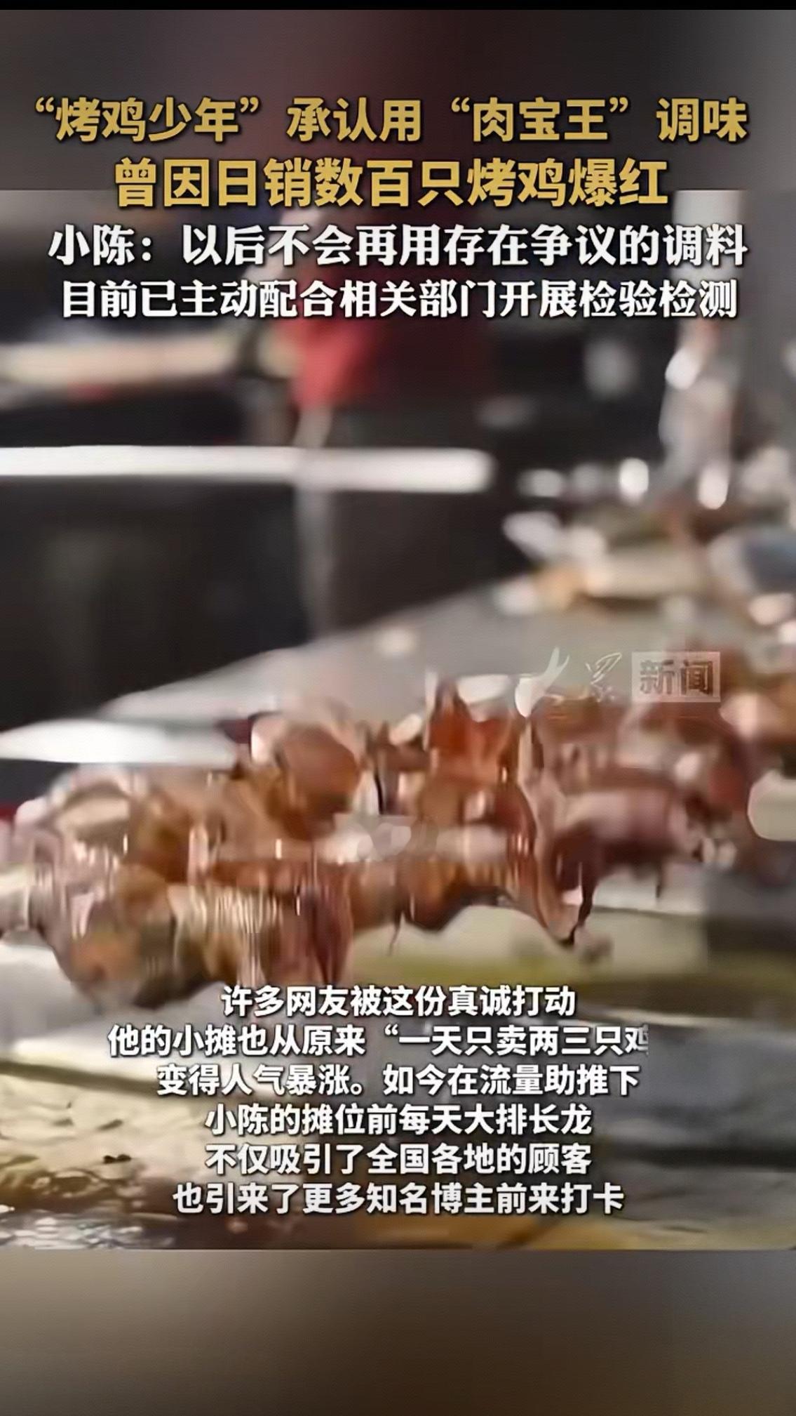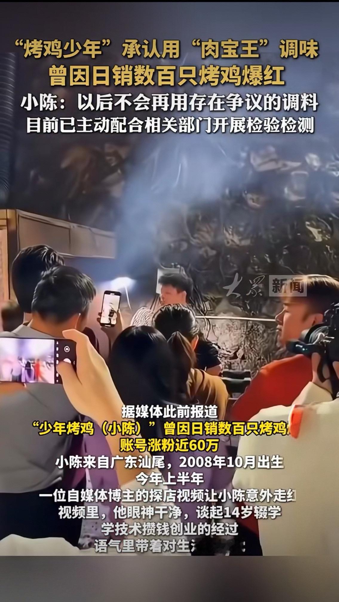 16岁烤鸡少年的"调味争议":流量之下,谁在苛求一个追梦少年? “烤鸡少年”小陈的故事,曾让无数人直呼“看到了草根逆袭的希望”。14岁辍学从汕尾农村来深圳打拼,电子厂流水线、搬运工的苦活都干过,攒下1万元启动资金支起烤鸡摊,凭借超越年龄的沉稳和“关掉爸妈五点闹钟”的初心,靠着一口烤鸡日销数百只、营收过万,成为全网追捧的励志标杆 。可谁也没想到,一场“肉宝王”风波,让这个16岁少年被推上了舆论风口。 “肉宝王”到底是什么?让网友如此紧张?其实这款在电商平台随处可见的复合调味料,成分里的麦芽糊精、淀粉、食用盐都是厨房常见原料,食品添加剂也在国家标准限量内,厂家生产25年,餐饮行业使用更是超过二十年 。食品安全专家明确表示,合规使用下无需过度担心,它的作用类似鸡精,只是增香提鲜效果更突出,过量添加反而会变味,商家既不会也没必要“猛加” 。 可争议还是炸开了锅。有人质疑“68元一只烤鸡靠添加剂提味”,有人翻出“AI迈巴赫”的旧闻吐槽“人设翻车”,甚至有人揣测“用添加剂掩盖食材不新鲜”。但比起这些苛责,小陈的回应更显担当:不否认使用,说明是正规合规产品,主动配合监管部门抽检,还承诺“以后不再用有争议的调料”,把检测结果张贴在店铺门口接受监督。 回头看这个少年的创业路,没有专业团队,视频是和哥哥摸索着拍的;爆红后没有涨价,把利润投入店铺扩张,每月按时给家里打钱补贴家用 。他说“顾客喜欢的是我这个人,不只是烤鸡”,也坦言“差评都是老师,说服务不好就改善,说味道不好就提升” 。这样的通透和坚韧,在成年人中都少见。 这场争议的本质,或许是公众对“网红食品”的信任焦虑,是对“科技与狠活”的本能警惕。但我们不能忘了,小陈只是个16岁的创业者,他在合规范围内使用常见调味料,比起那些藏着掖着、违规操作的商家,他的坦诚已经难能可贵。食品安全的底线需要坚守,但对一个努力生活、主动担责的少年,是否也该多一份包容? 检测结果还在等待,小陈的烤炉或许还在炭火中转动。当我们苛求“零添加”的完美时,是否忽略了餐饮行业的常态?当我们追捧草根逆袭的神话时,是否又容不下一点不完美?你愿意给这个知错就改的少年一次机会吗?欢迎在评论区说说你的看法。