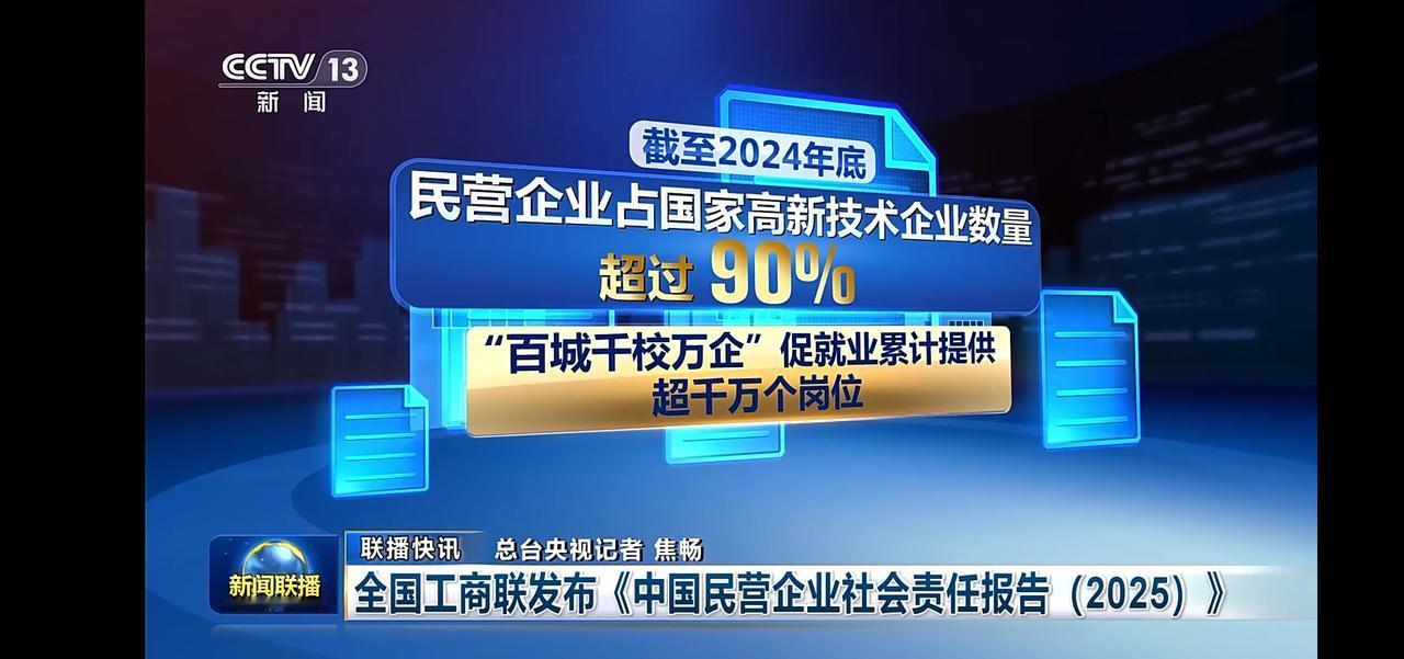 全国工商联发布《中国民营企业社会责任报告(2025)》,民营企业占国家高新技术企业数量超过90%,累积提供就业岗位超千万个。