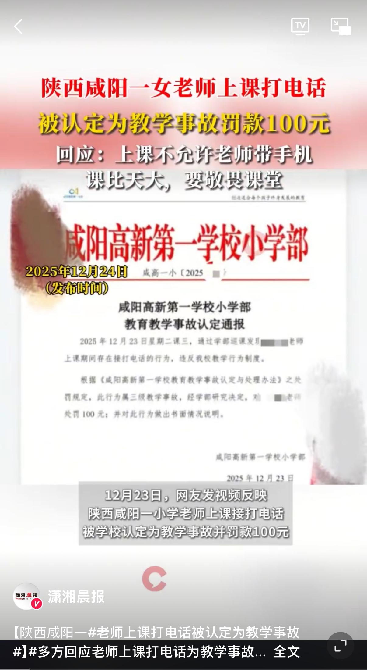 上课接个电话被罚100元?陕西一小学“铁腕”治教引全网热议! “课比天大,要敬畏课堂!” 这句在教师圈流传的话,最近在陕西咸阳的一所小学里,真真切切地“落地”了。一位女老师仅仅因为在上课期间接了一个电话,就被学校认定为“三级教学事故”,不仅被罚款100元,还被要求写书面检查。 这事儿一出,瞬间在网上炸开了锅。有人拍手叫好,认为早就该治治这种“不务正业”;也有人替老师喊冤,觉得万一真是家里有急事呢,罚得太严是不是有点不近人情? 事情发生在12月23日下午,咸阳高新第一学校小学部的第三节课期间。 * 现场情况: 学校巡查人员在例行巡班时,发现一位女老师正在讲台上手持手机接听电话。当时老师一手拿手机贴在耳边,一手还拿着粉笔,底下的学生有的看热闹,有的趁机开小差,课堂秩序受到了影响。 * 处理结果: 学校动作很快,依据校内的《教育教学事故认定与处理办法》,直接定性为三级教学事故。处罚决定:罚款100元 + 提交书面情况说明 + 通报批评。 面对外界关于“处罚是否过严”的质疑,校方的态度非常明确: 1. 有章可循: 学校明确规定,严禁老师将手机带入教室,上课接打电话更是绝对禁止的红线。 2. 核心理念: 接受采访时,一位该校的任课老师说了八个字——“课比天大,敬畏课堂”。在他们看来,课堂是神圣的,老师站在讲台上,40分钟内就必须全身心投入,任何与教学无关的行为都是对学生的不负责。 🤔 网友吵翻了:是严管还是苛责? 这件事之所以引发这么大的讨论,是因为它戳中了大家对“规则”与“人情”的不同看法: * 支持派(严管出高徒): * “支持学校!老师上课都带头玩手机,凭什么要求学生专心听讲?” * “上课铃响就是命令,这时候天大的事也得先放一边,这是职业素养。” * “罚100元都不够买个手机壳的,但这顶‘教学事故’的帽子戴得好,能警示所有老师。” * 反对派(缺乏人性化): * “万一家里老人病了、孩子出事了,这种紧急电话不接吗?规定不能一刀切。” * “巡查的人就不能先了解一下情况?直接上来就定性事故,太冰冷了。” * “与其罚老师,不如看看是不是学校没给老师提供应急通讯的渠道。” 写在最后: 这100元罚款,罚的是一个人,警醒的是一群人。“课比天大”这四个字,不仅是对老师的高要求,更是对教育公平的底线坚守。 但话说回来,规矩是死的,人是活的。 在严格执行制度的同时,学校是不是也该给老师留一条“应急通道”?比如遇到真正的紧急情况,如何既能处理急事,又不耽误学生? 对此,你怎么看?如果是你,你会支持学校的处罚吗? 素材来源:潇湘晨报、中华网新闻等媒体公开报道 (注:文中图片源于网络,如有侵权请联系删除)